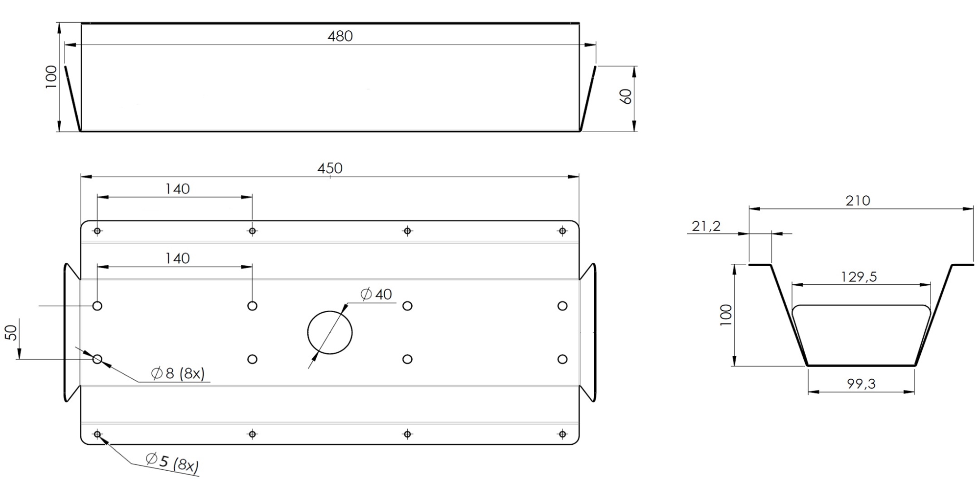 BL-BASKET480B kabelbakke i sort til konferenceborde. Stregtegning med mål af BL-BASKET480B kabelbakke i sort til konferenceborde.