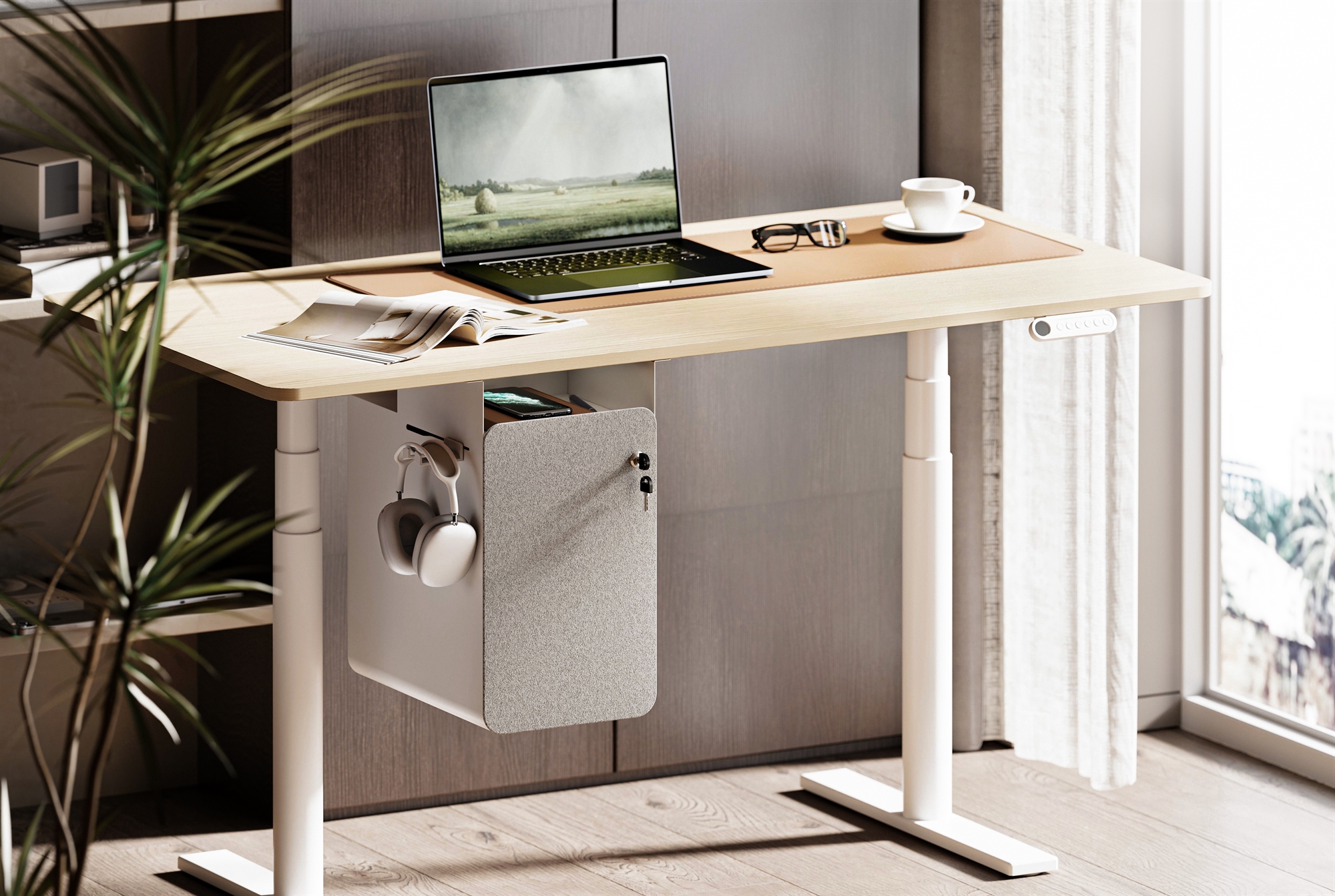 Praktisk opbevaringsskab i hvid med lås til montering under skrivebordet.