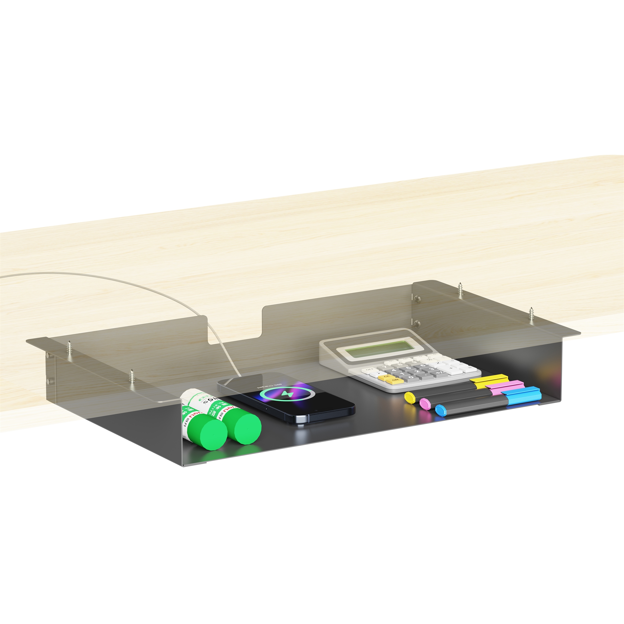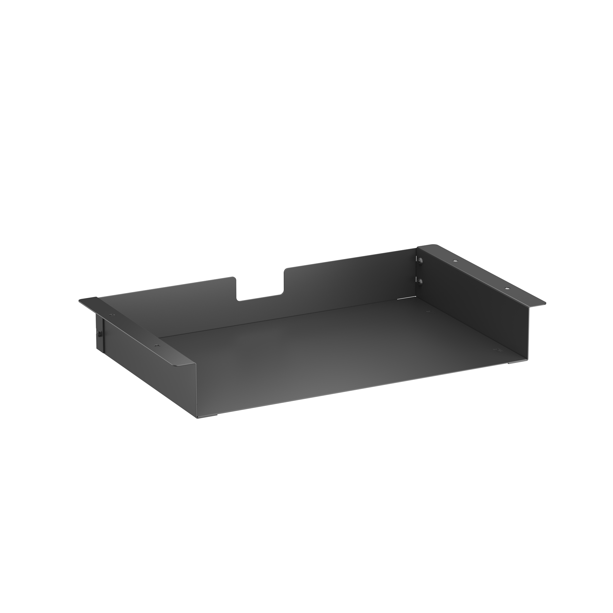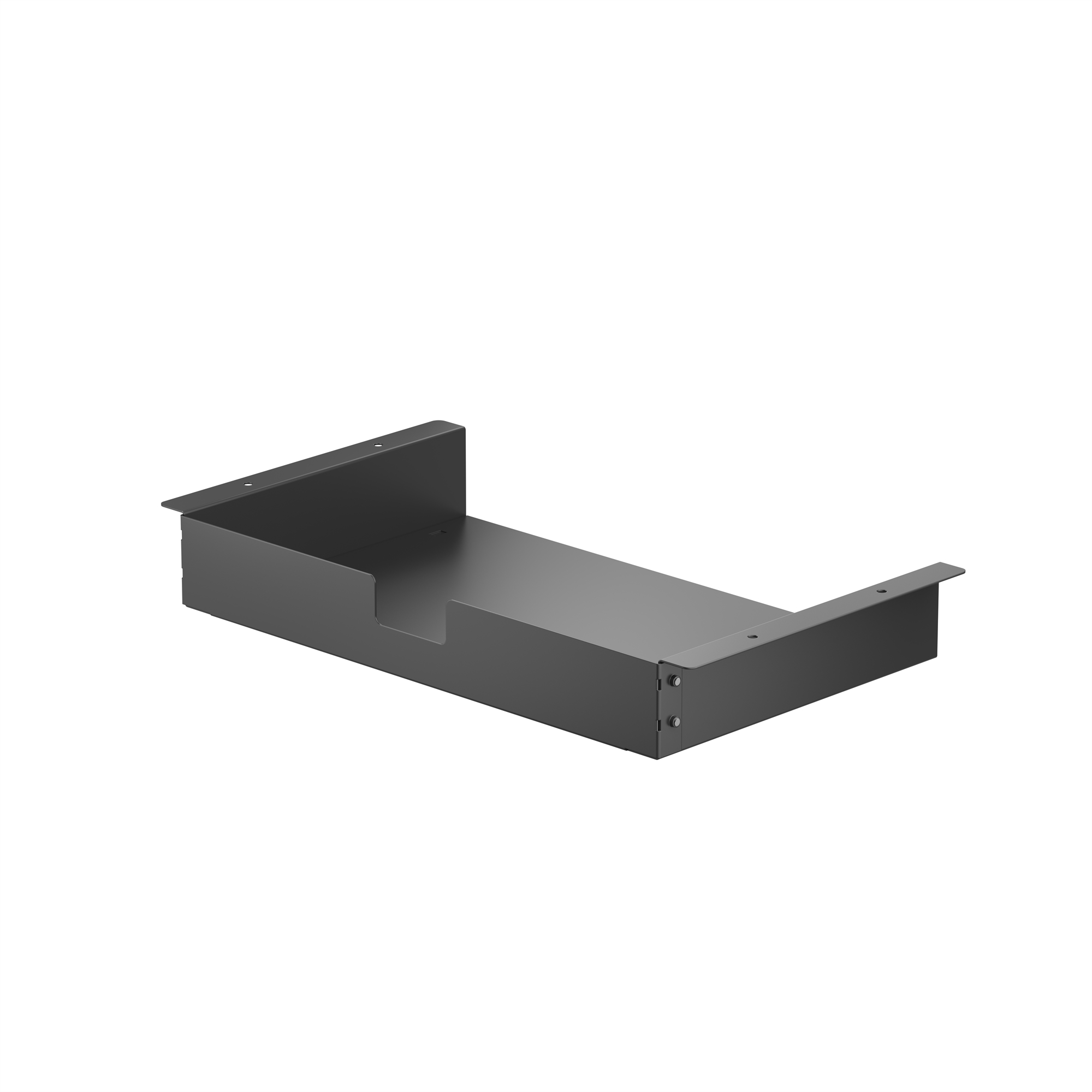 Praktisk opbevaringshylde i sort til montering under skrivebordet.