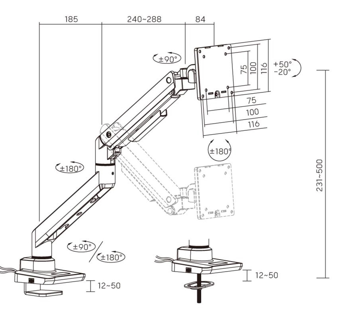 Prisvenlig skærmarm L-FDMH-1 i sort fra Complement.Stregtegning med mål af skærmarm L-FDMH-1 fra Complement.