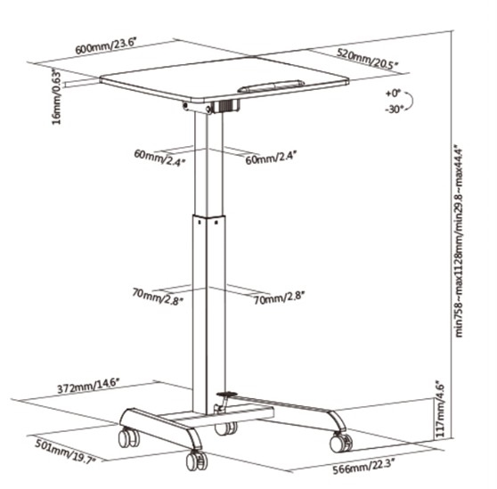 Denne mobile arbejdsstation i sort fra Complement har både hæve/sænke- samt vipfunktion. Bordpladen kan vippes i 4 positioner op til 30 grader, så man kan bruge bordet til talepult o.lign. Bordet er uden ledninger og er derfor CO2 neutralt, da hæve/sænke funktionen er styret af en gascylinder, som gør det nemt at betjene med den praktiske fodpedal. Dette gør også bordet til en god mobil og ergonomisk arbejdsplads, der kan bruges i alle miljøer. Bordet er perfekt som mobil arbejdsplads da der medfølger låsbare hjul.