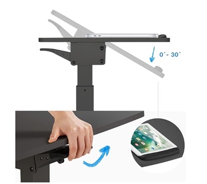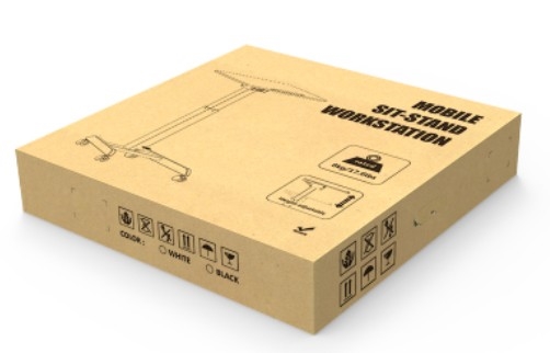 Detaljebillede med vippefunktionen.Miljøbillede af mobil arbejdsstation i sort med hæve- og vippe funktion.Stregtegning med mål af mobil arbejdsstation i sort med hæve- og vippe funktion.Billede af emballagen til mobil arbejdsstation i sort med hæve- og vippe funktion.