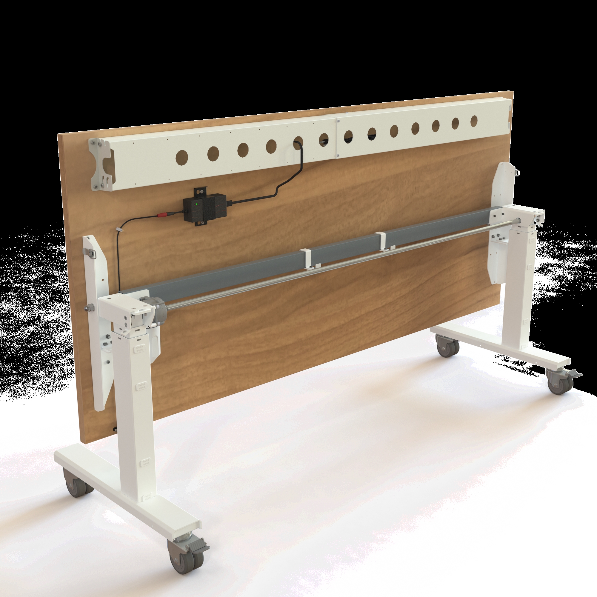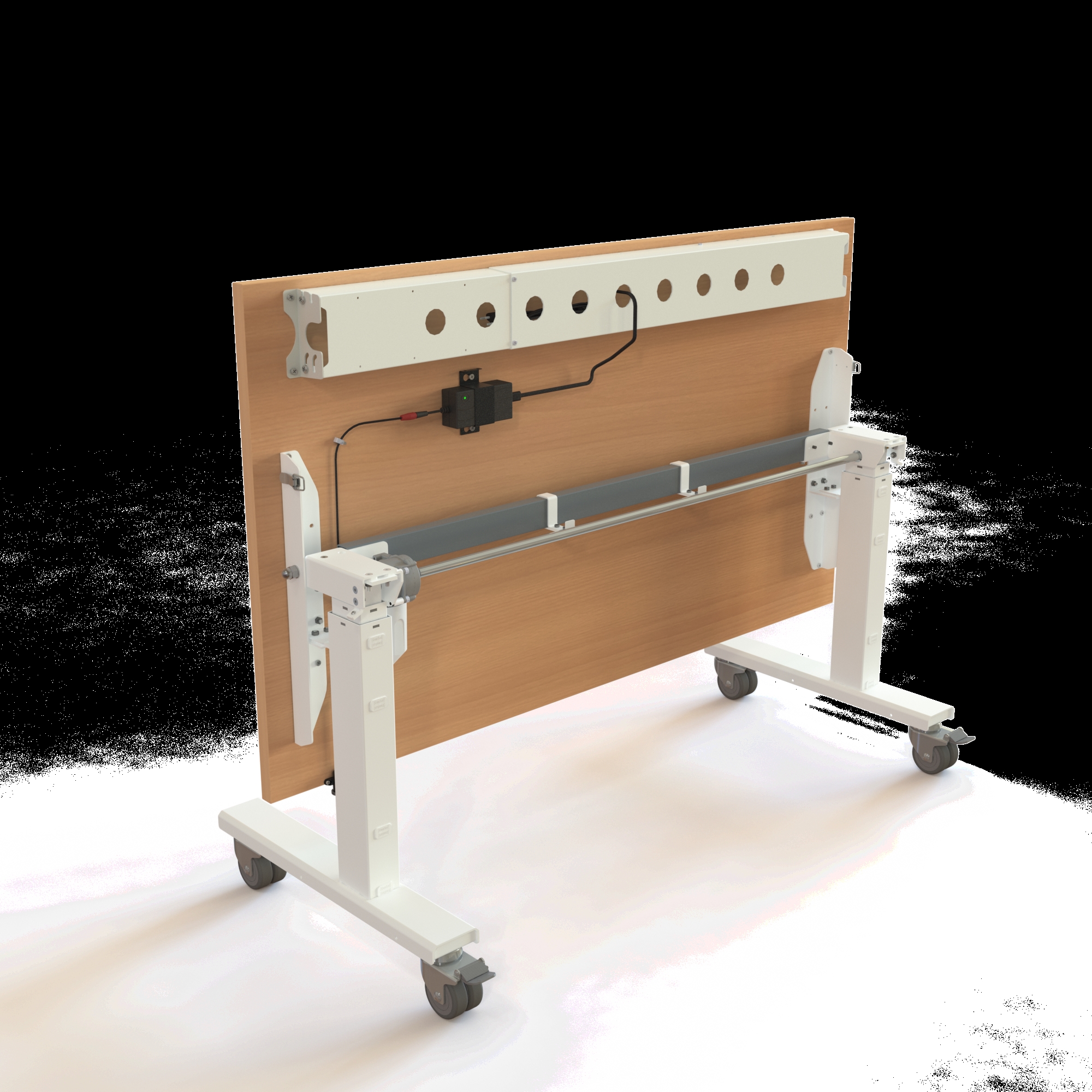Bordet løfter op til 40 kg og kan justeres mellem 67-132 cm, hvilket eliminerer bekymringen for, at hjulene gør bordet for højt til en korrekt siddestilling. Understellet i pulverlakeret stål RAL 9016 (hvid) bærer den solide melamin-bordplade, der er kendetegnet ved sin høje slidstyrke.