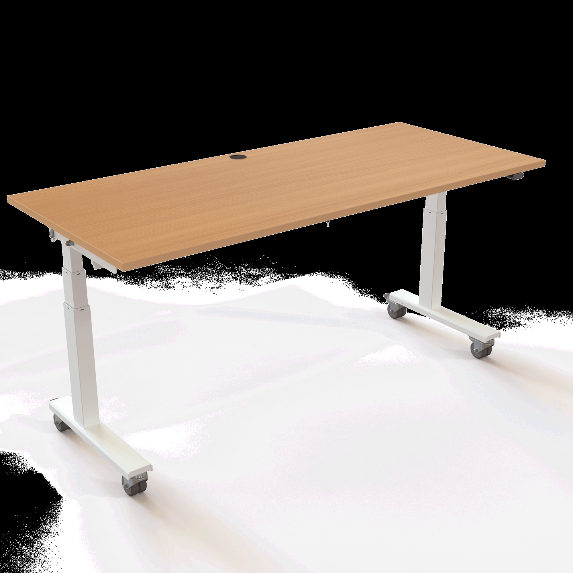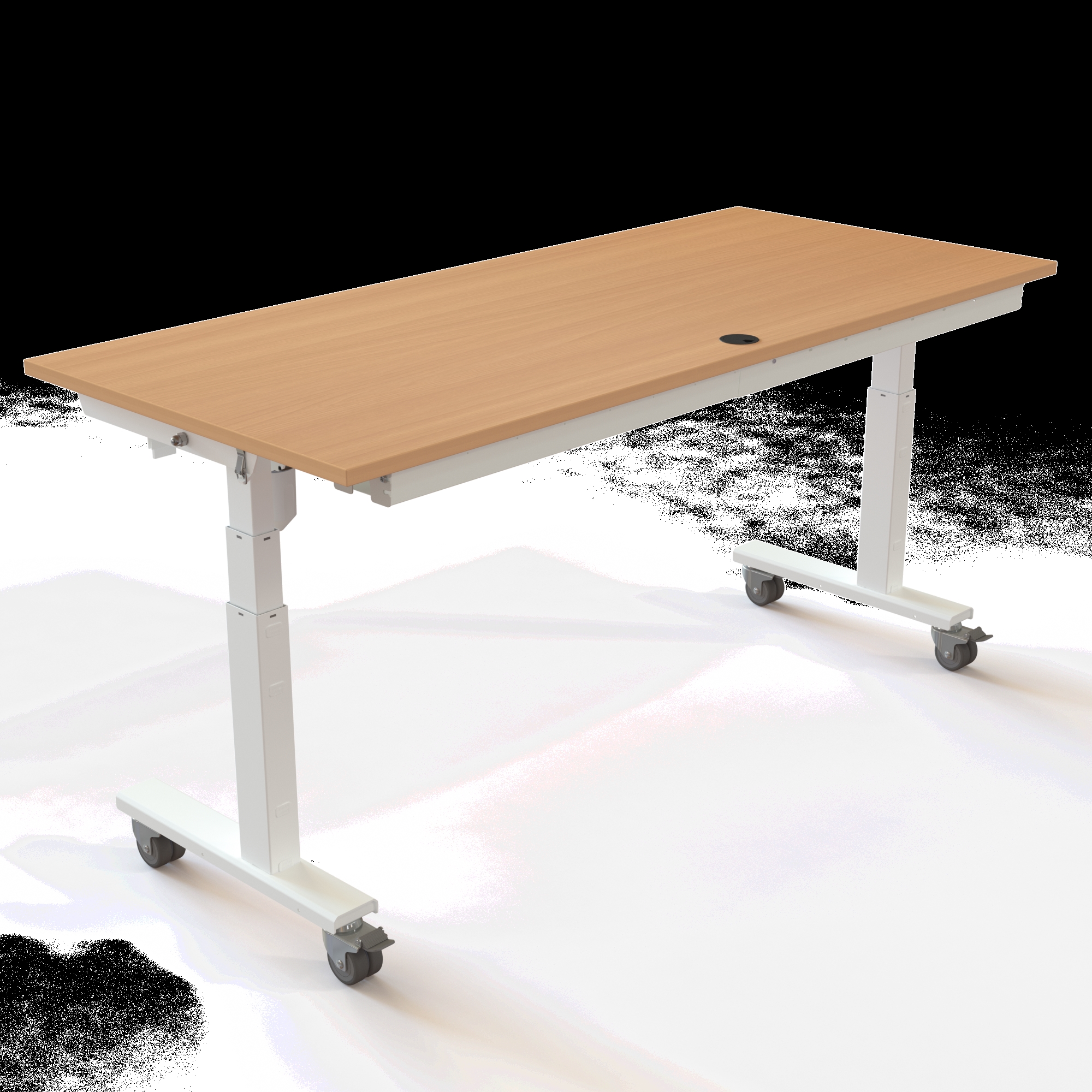 Bordet løfter op til 40 kg og kan justeres mellem 67-132 cm, hvilket eliminerer bekymringen for, at hjulene gør bordet for højt til en korrekt siddestilling. Understellet i pulverlakeret stål RAL 9016 (hvid) bærer den solide melamin-bordplade, der er kendetegnet ved sin høje slidstyrke.
