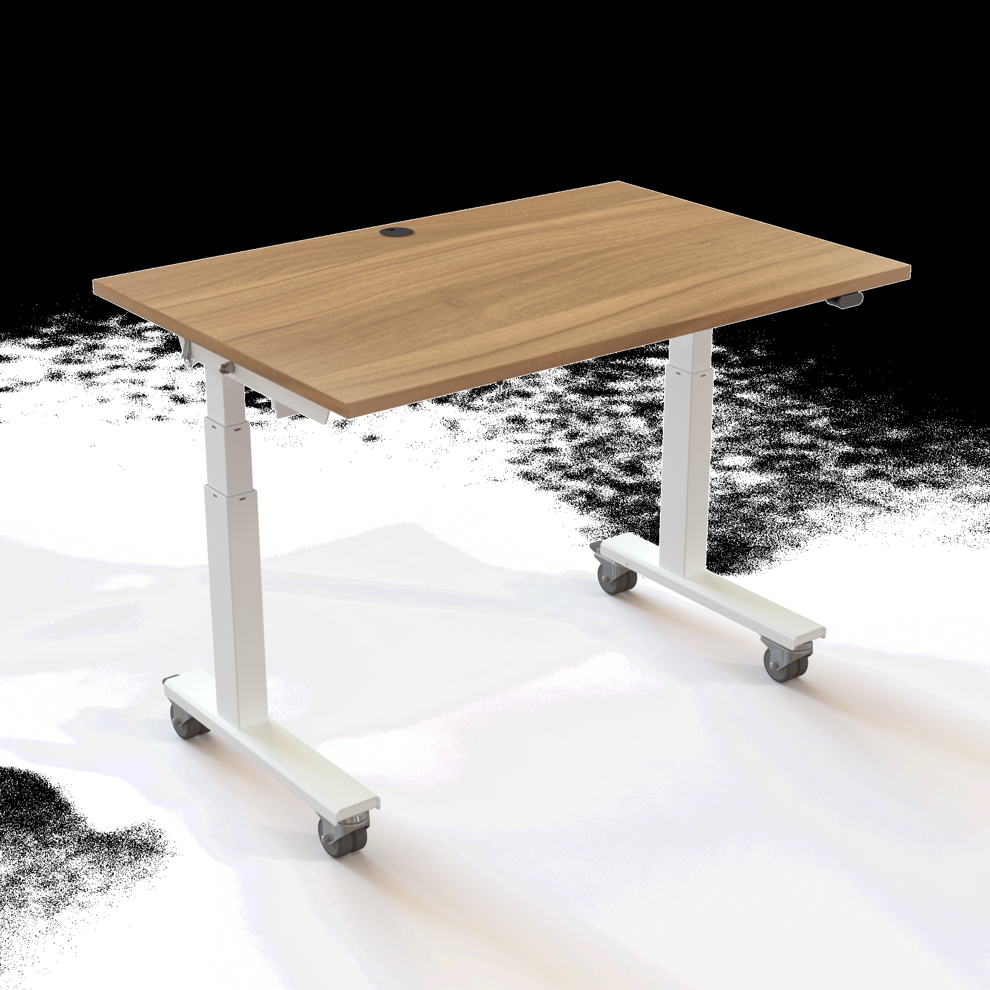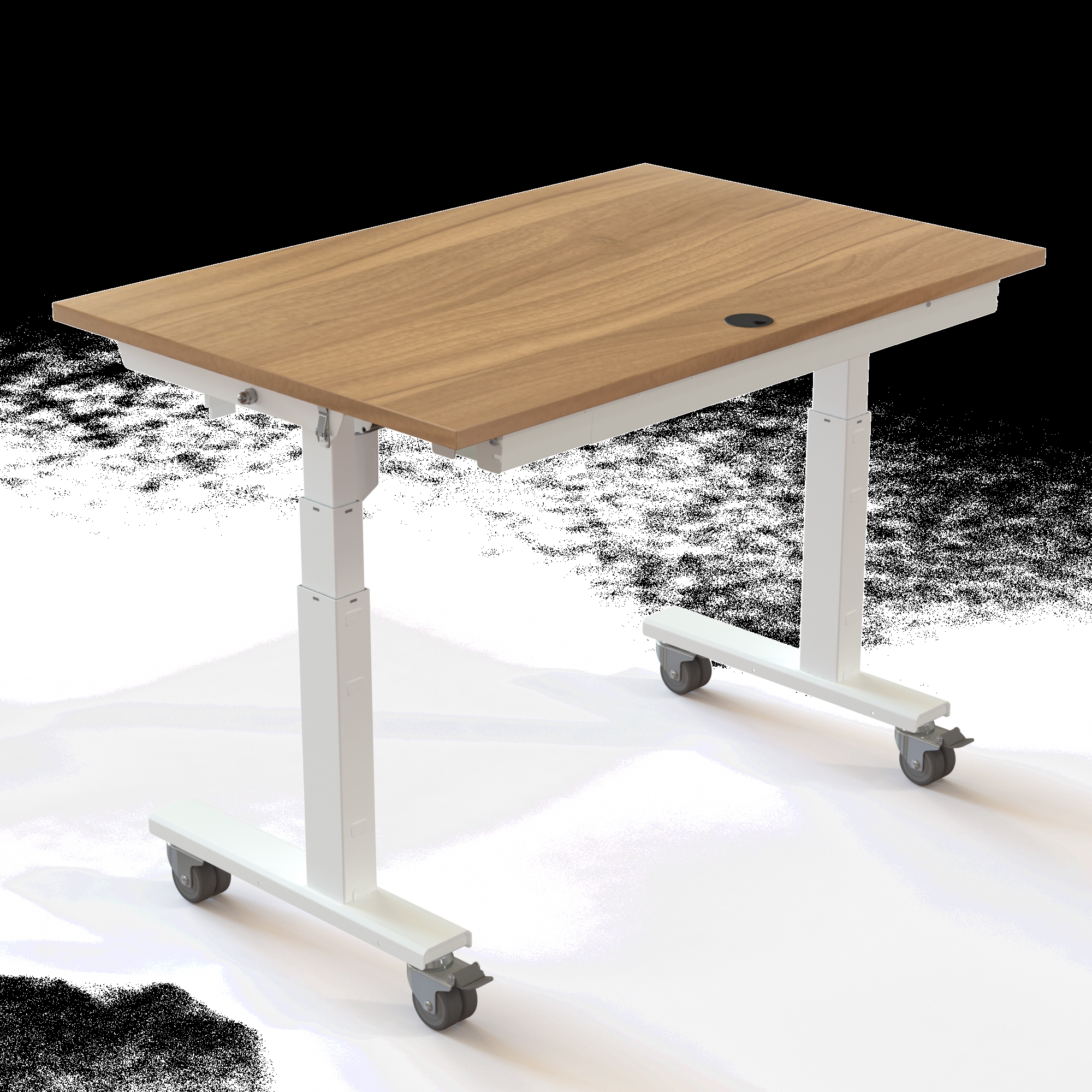 Bordet løfter op til 40 kg og kan justeres mellem 67-132 cm, hvilket eliminerer bekymringen for, at hjulene gør bordet for højt til en korrekt siddestilling. Understellet i pulverlakeret stål RAL 9016 (hvid) bærer den solide melamin-bordplade, der er kendetegnet ved sin høje slidstyrke.