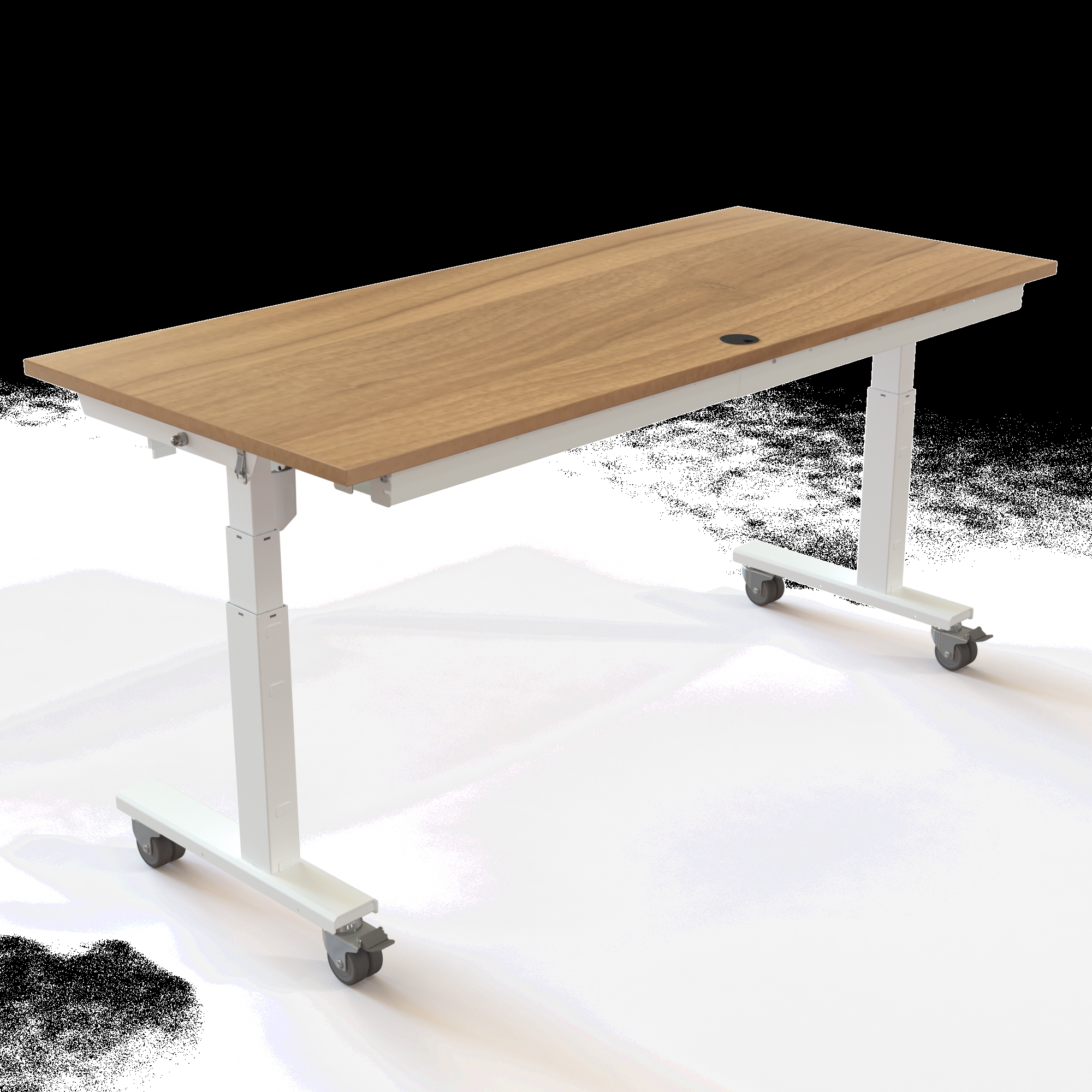 Bordet løfter op til 40 kg og kan justeres mellem 67-132 cm, hvilket eliminerer bekymringen for, at hjulene gør bordet for højt til en korrekt siddestilling. Understellet i pulverlakeret stål RAL 9016 (hvid) bærer den solide melamin-bordplade, der er kendetegnet ved sin høje slidstyrke.