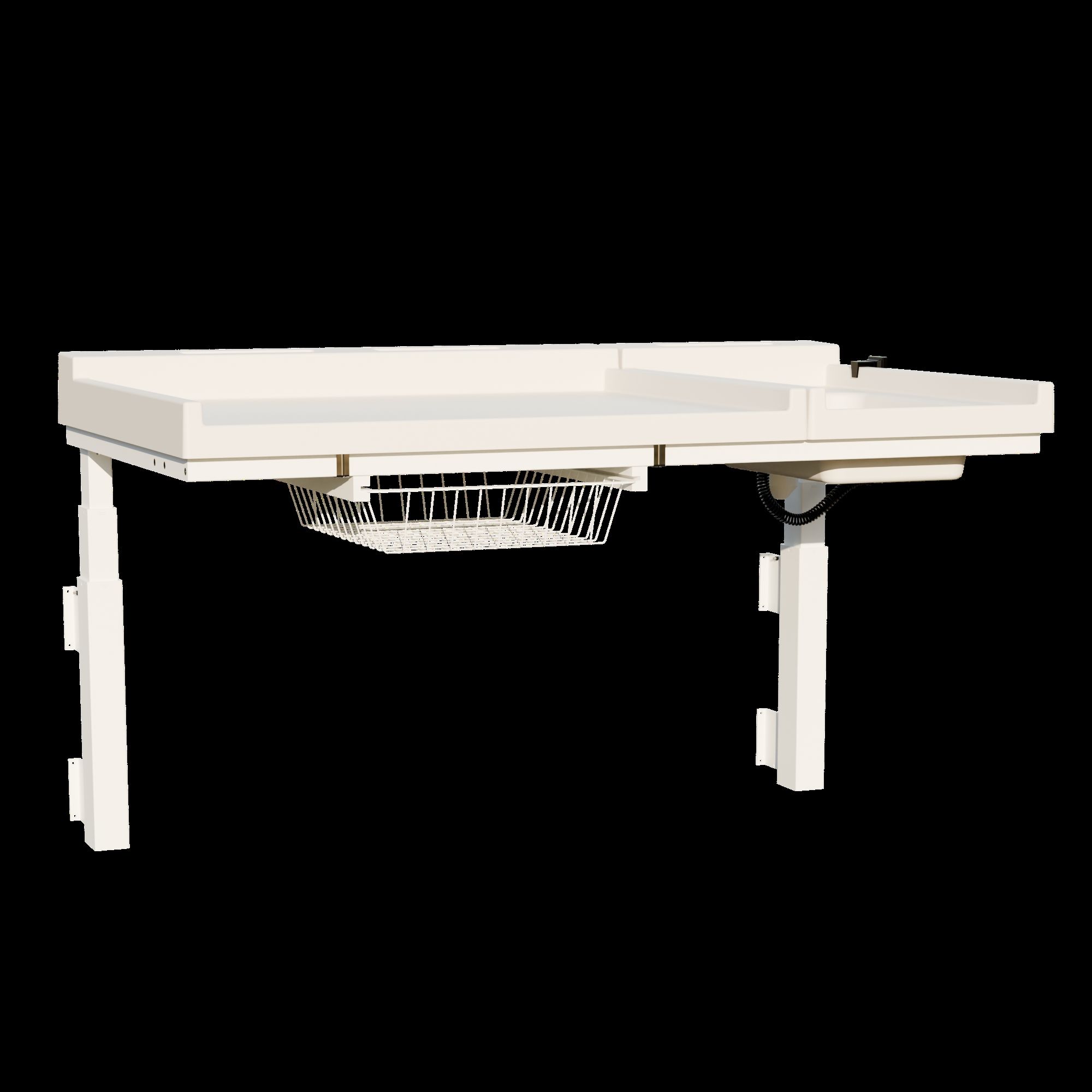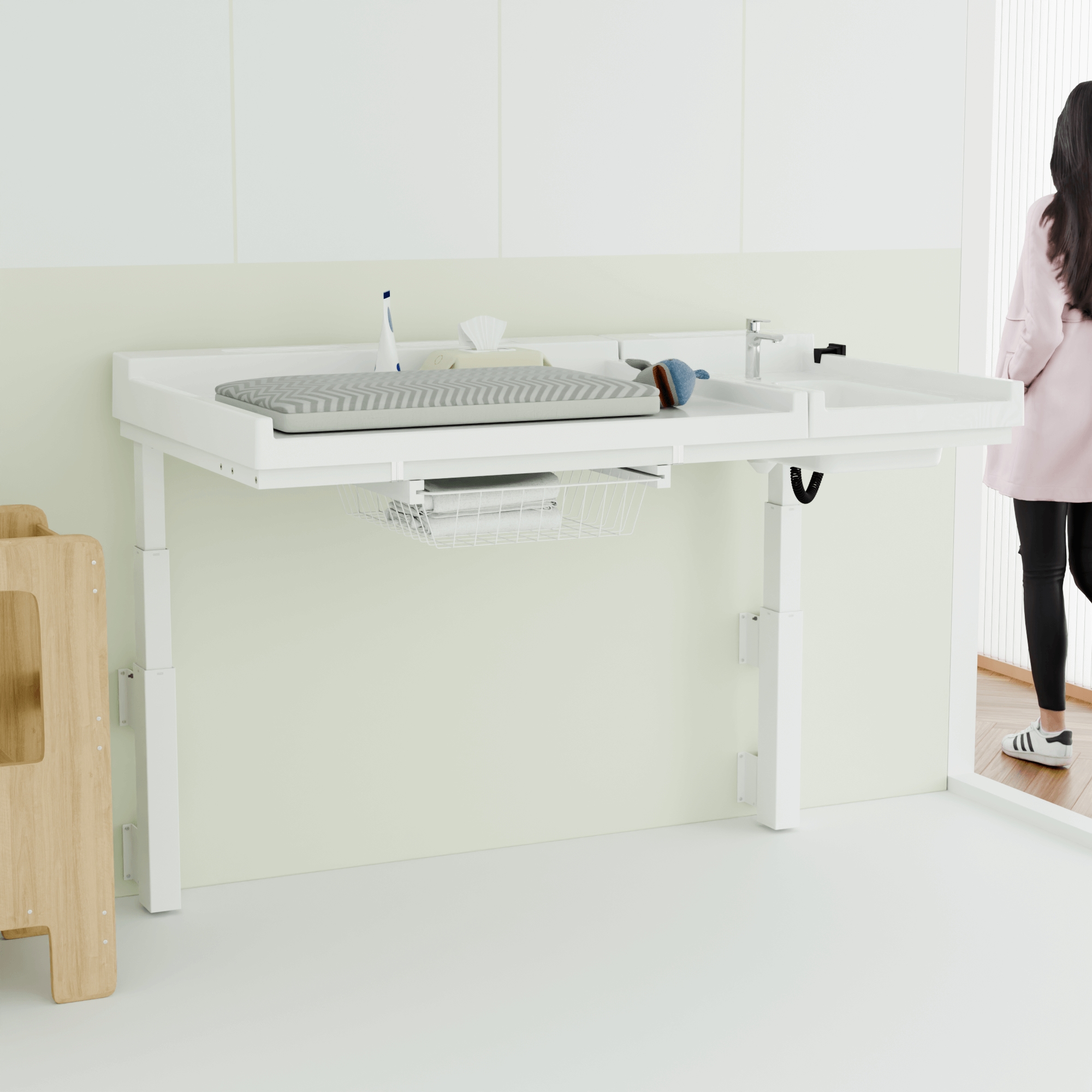 Vægmonteret puslebord med vask og hæve/sænkefunktion i professionel kvalitet fra Conset.
