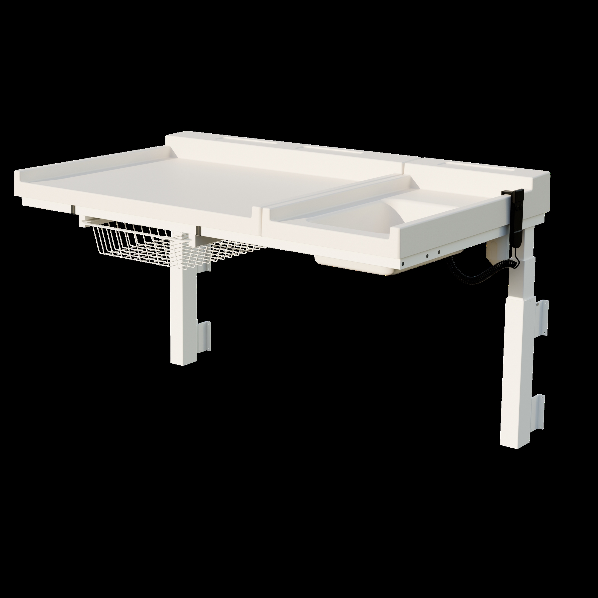 BWR129 fra Conset er et vægmonteret puslebord med vask og elektrisk hæve/sænkefunktion, udført i professionel kvalitet. Højden justeres nemt med det håndholdte betjeningspanel og kan justeres mellem 58 og 118 cm, så man kan indstille bordet til en korrekt ergonomisk arbejdsstilling for personalet. Den praktiske vægmontering betyder, at der ikke er ben i vejen for rengøring med mere. Bordet har vakuumformet plade udført i ABS - et bakterieresistent plast materiale, som er nemt at holde rent. Pladen har afrundede kanter. Pladens udvendige mål er 100x85 cm. Vasken kan monteres på begge sider af puslepladen og skal tilsluttes vand og afløb af en autoriseret installatør. Trådkurv er inkluderet. Pusleområdet indenfor barriererne er 93x70 cm - langt de fleste gængse puslemåtter passer derfor til bordet. Toppladens forhøjede forkant hjælper med at holde væsker og snavs på plads – og gulvet rent.
