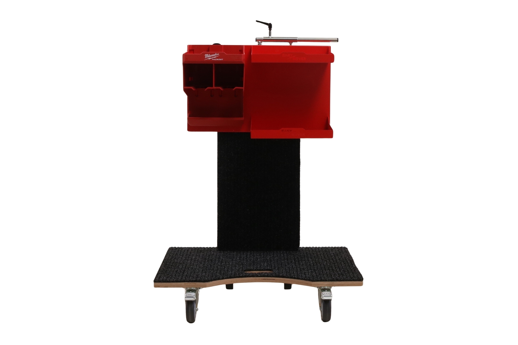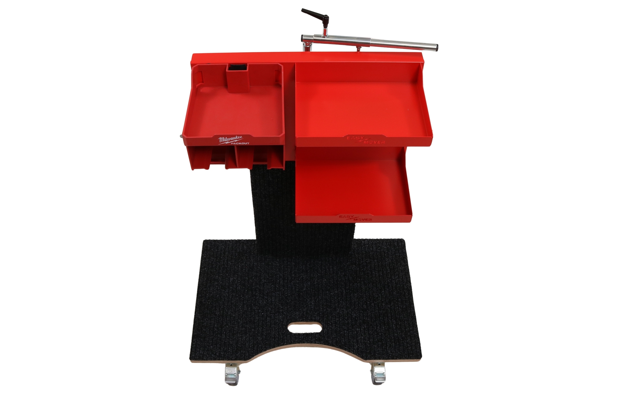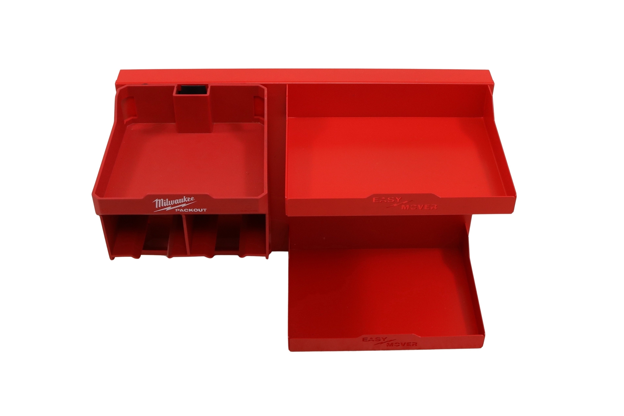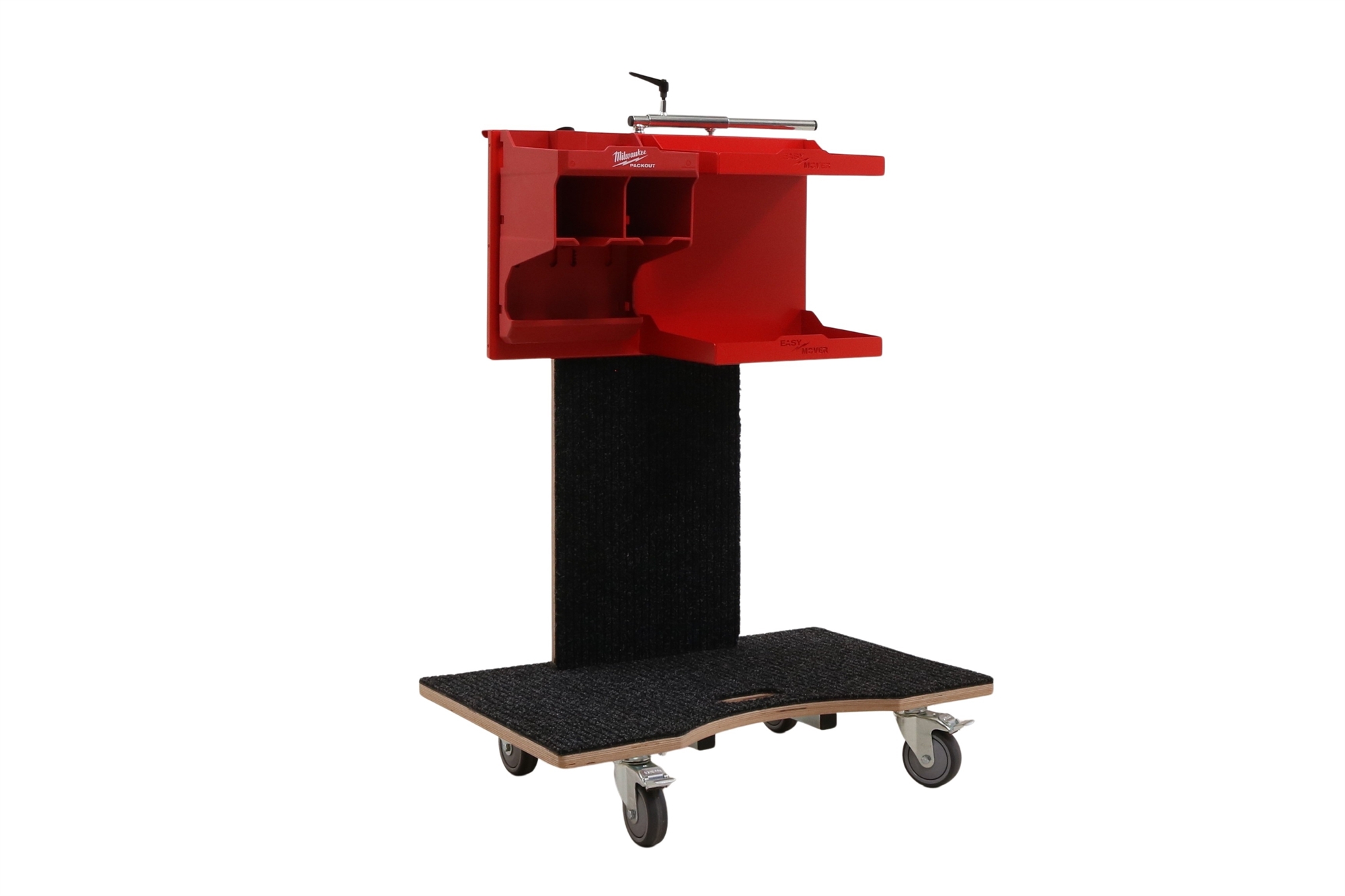 Easy-Mover EMT1 tilbehørssæt til EM1 bordvogn er designet specifikt til håndværkeren eller servicemedarbejderes i virksomheden, der forestår montering, opbevaring eller flytning af borde og skriveborde. Tilbehøret påsættes EM1 bordvognens rygplade og kan nemt løftes af og på. Tilbehøret er udført i rødmalet punktsvejset metalplade og består af en bagplade med to opbevaringshylder. Desuden medfølger en Milwaukee holder til bore/skruemaskiner samt to Milwaukee tilbehørsholdere (på bagsiden af bagpladen) hvorpå man kan påsætte ønskede tilbehørsholdere.