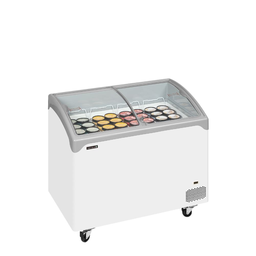 NIC-SCEB er en serie af isfrysere i høj kvalitet, designet med rundede hjørner og kanter samt buede skydelåg i glas. Det er en solid og stabil fryser, der let kan flytte placering i forretningen, da den står på hjul. Den er oplagt til udstilling af diverse frosne madvarer, heriblandt vafler og ispinde. Komplet sæt kurve medfølger.