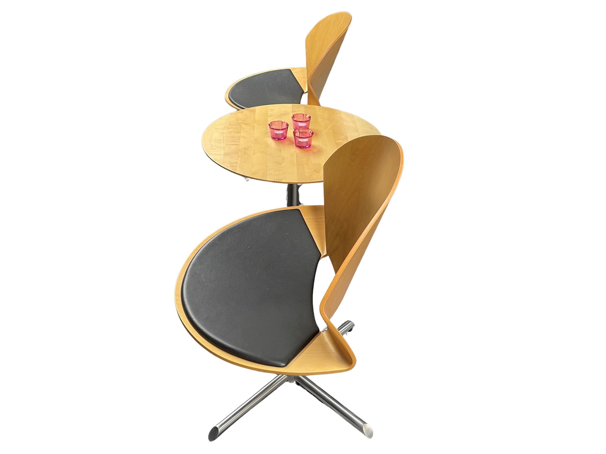 Stolen er udført i et design der understøtter den gode siddekomfort. Lounge sæt bestående af 2 stole i birkefiner med ægte læder sædehynde og poleret rustfritstål stel med retur-drej og sofabord i birke finér med affaset skrå kant og stel i poleret rustfritstål.