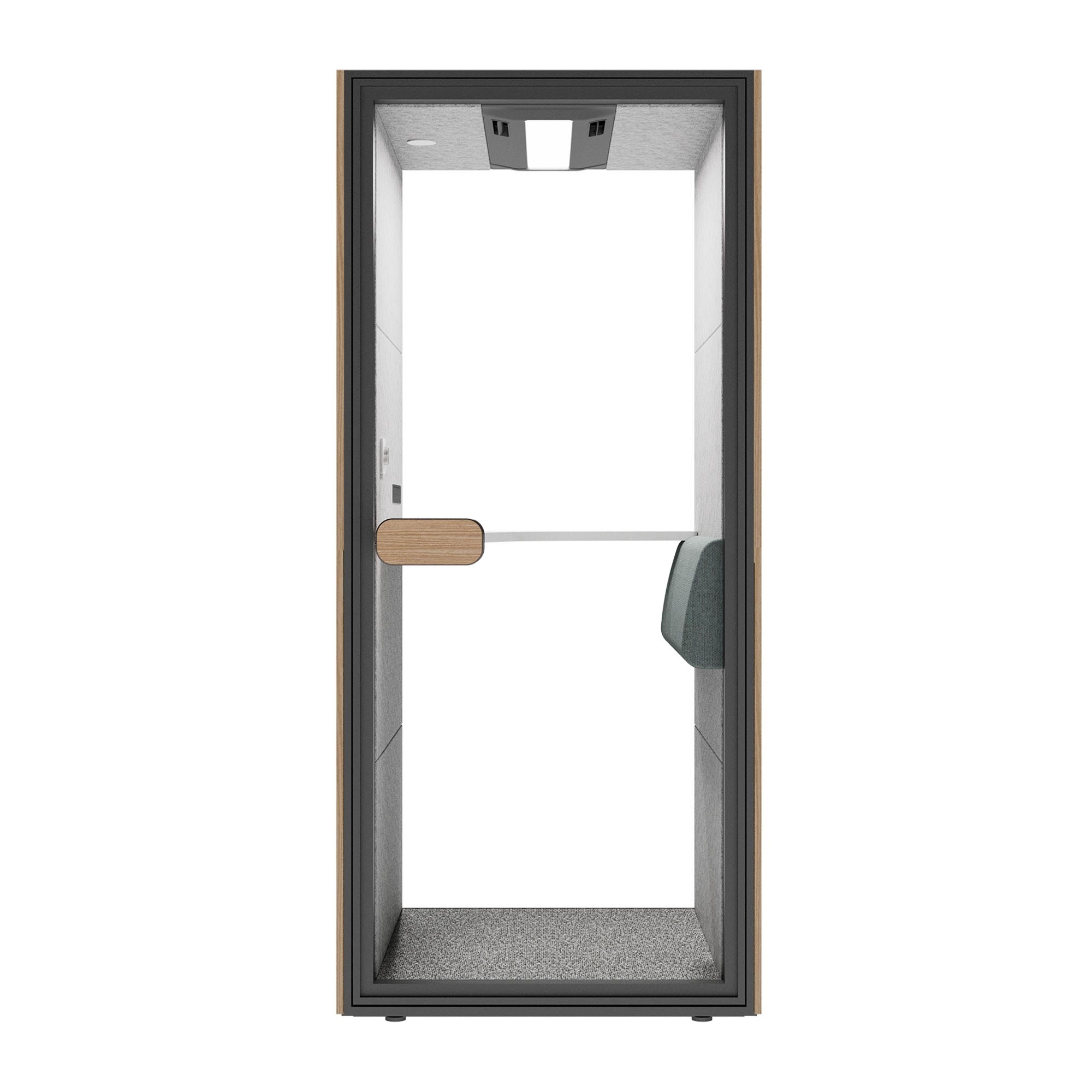 Boksen er bygget op med en kraftig base af massivt træ og stål, som giver en stabil og holdbar konstruktion. Vægge og loft er opbygget i lag, hvor lydabsorberende materialer er kombineret, så lyden både holdes ude og inde. Ydersiden er beklædt med flot træ laminat, der passer naturligt ind i kontormiljøet. Døren er højrevendt (hængslet i højre side).