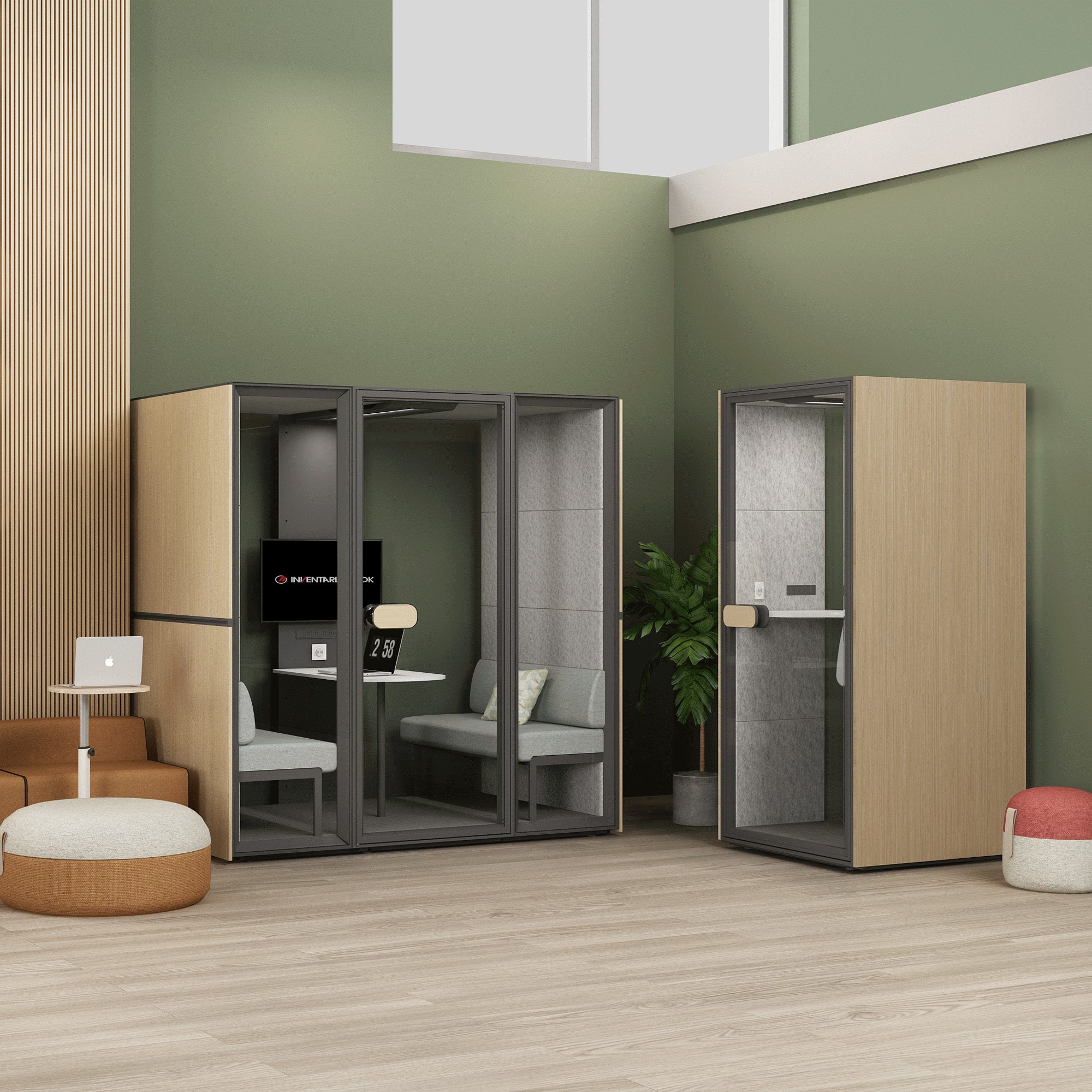 ME1 telefonboks fra FTI.Miljøbillede med ME1 telefonboks fra FTI - hervist sammen med ME3 møderum til 4 personer.