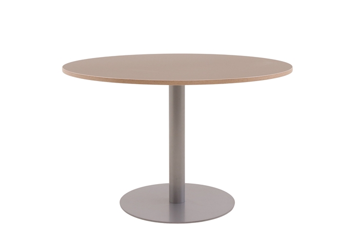 Fumac cafe/mødebord i lysebrun med sølvgrå søjle, set forfra.