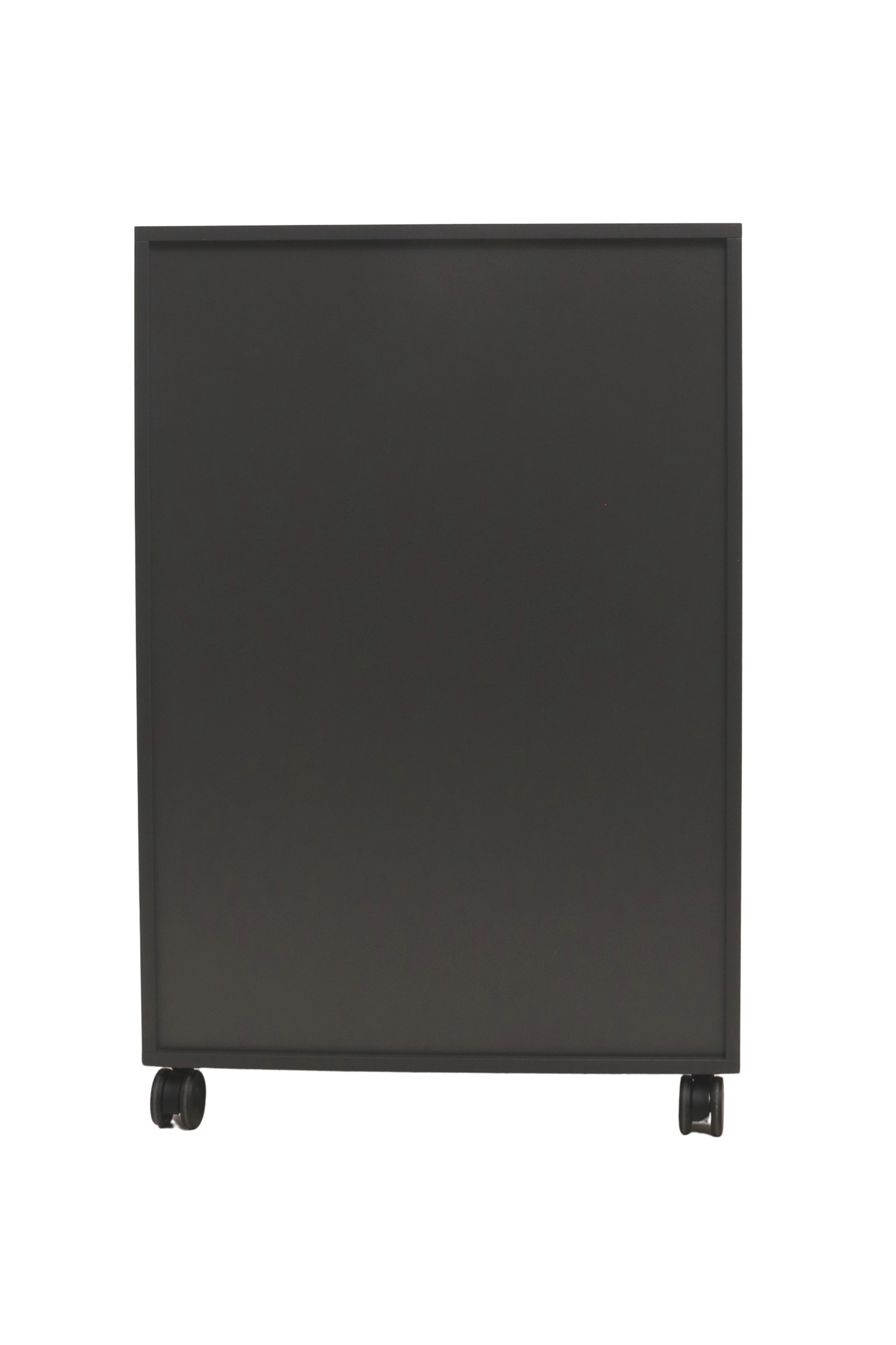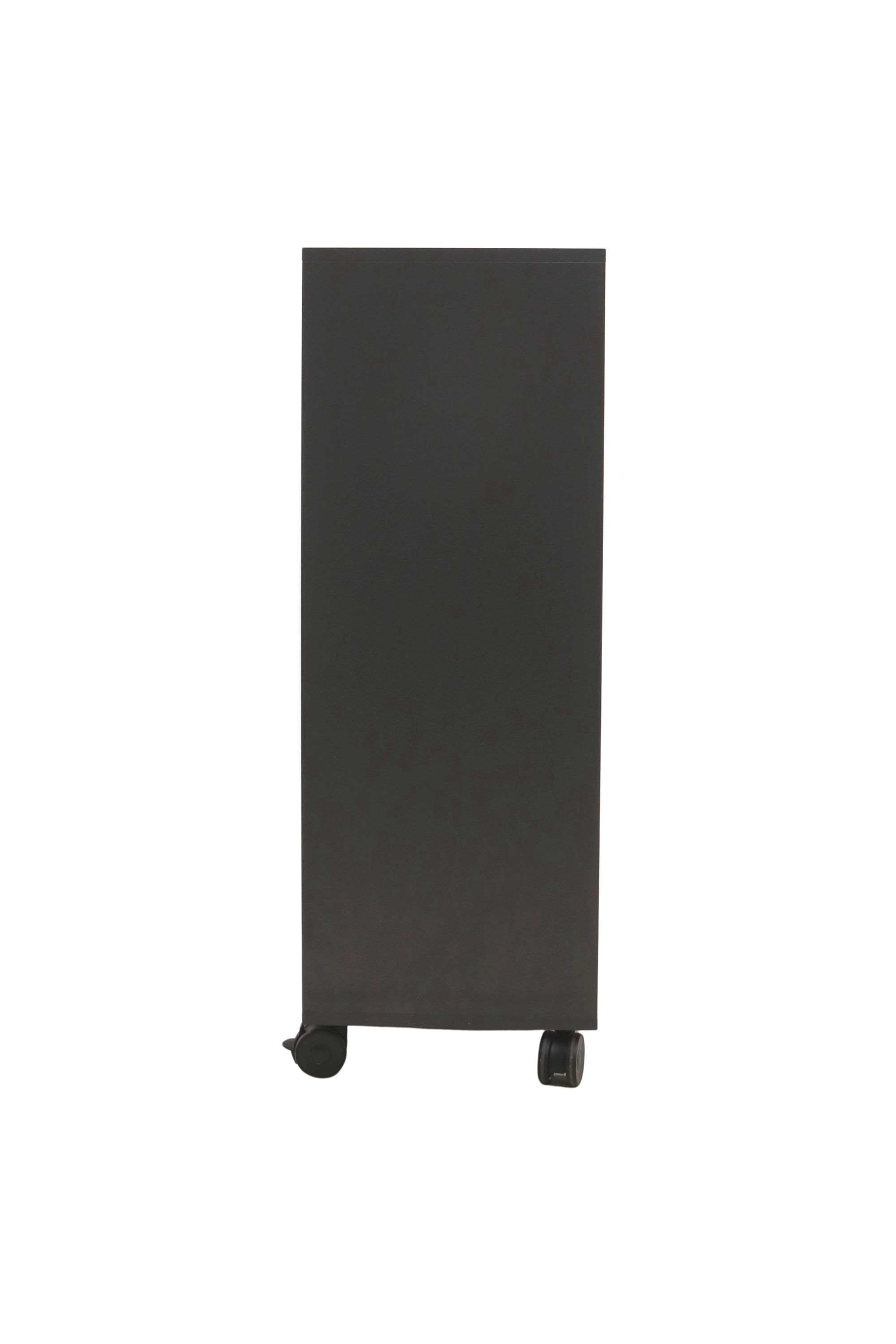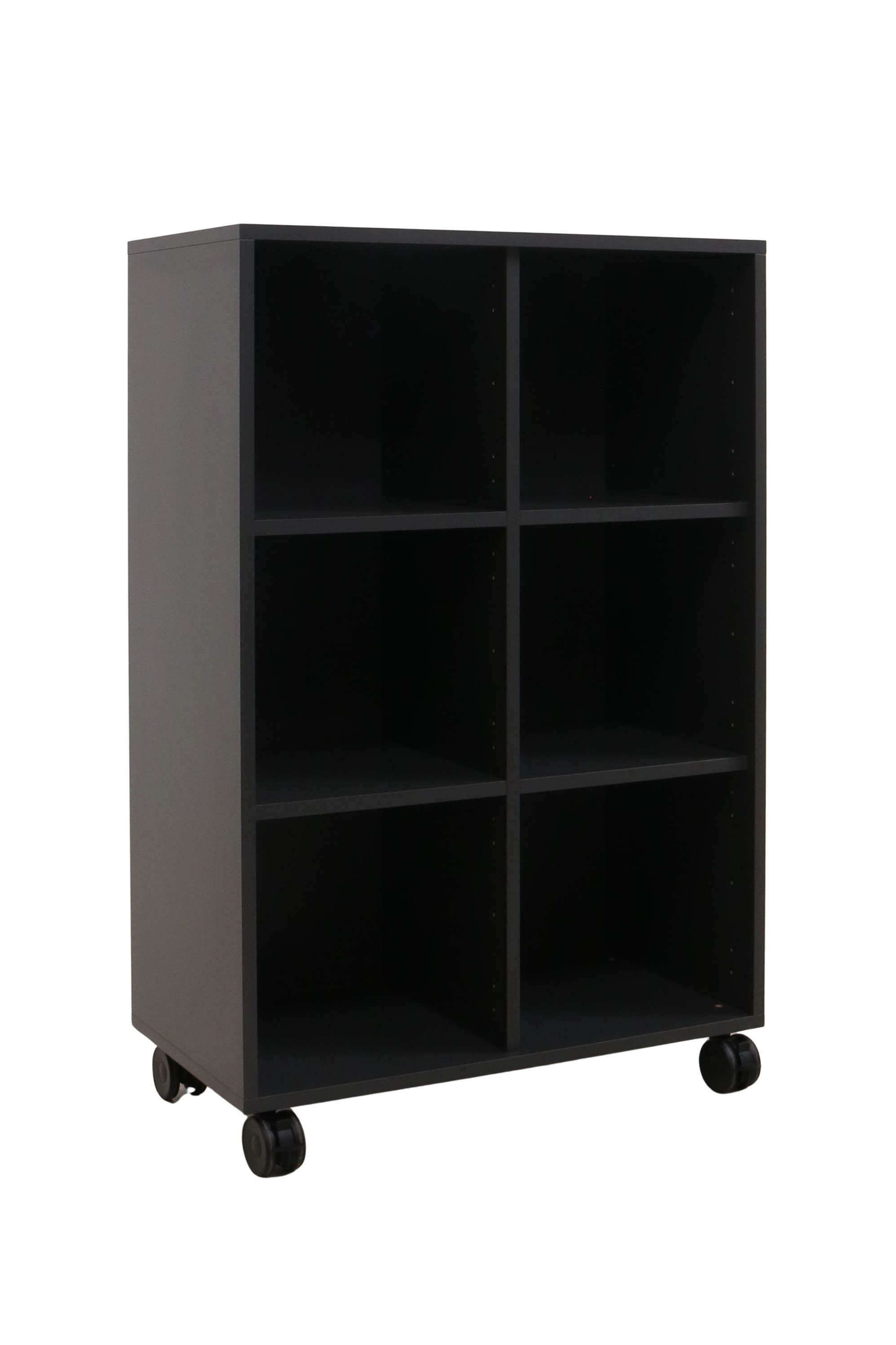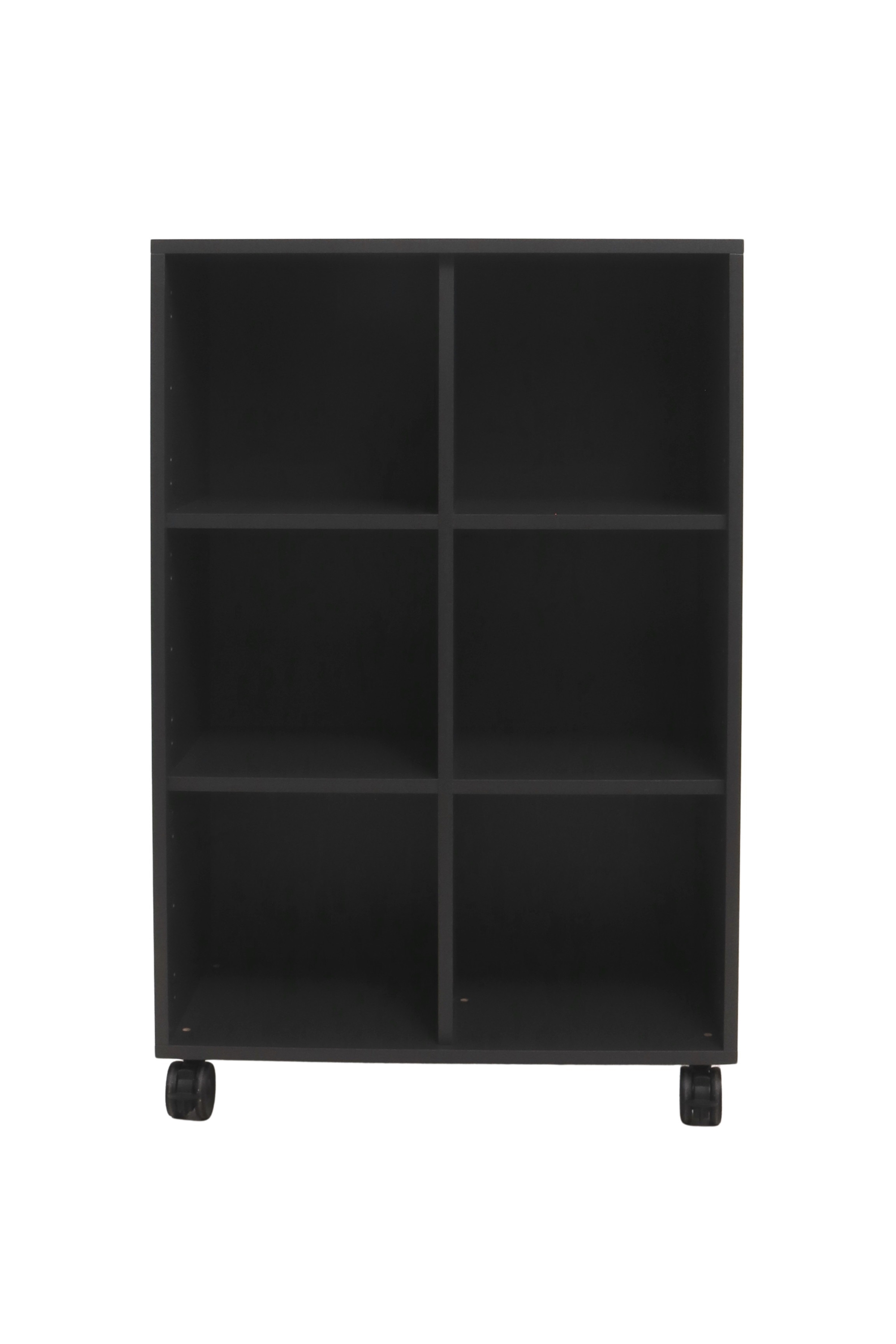 Moderne Jive reol i et pænt design fra Fumac i antracit decor laminat med 6 rum (2x3), som giver mange muligheder for opbevaring. Reolen har sorte plastikhjul med krom top & lås.