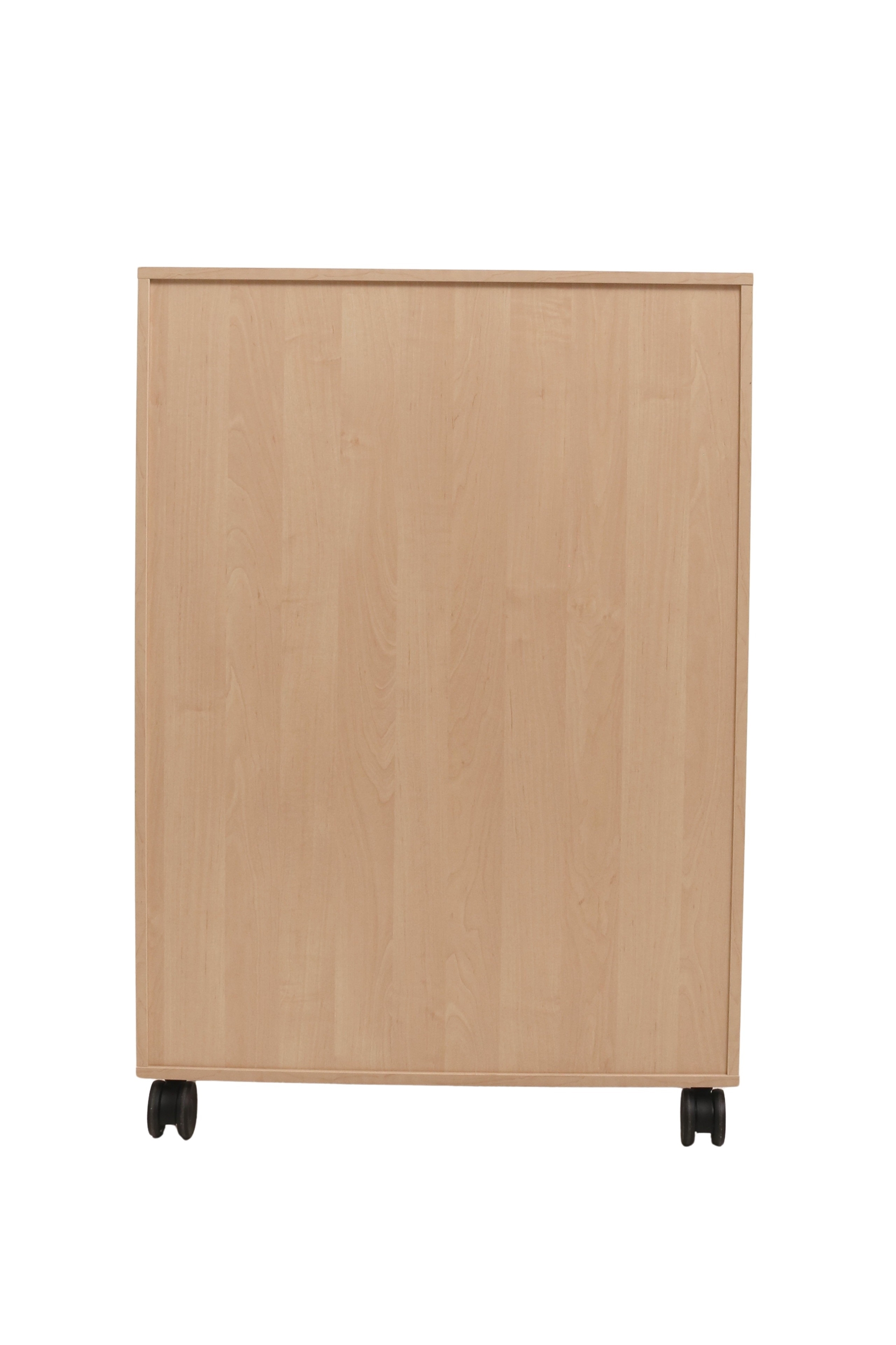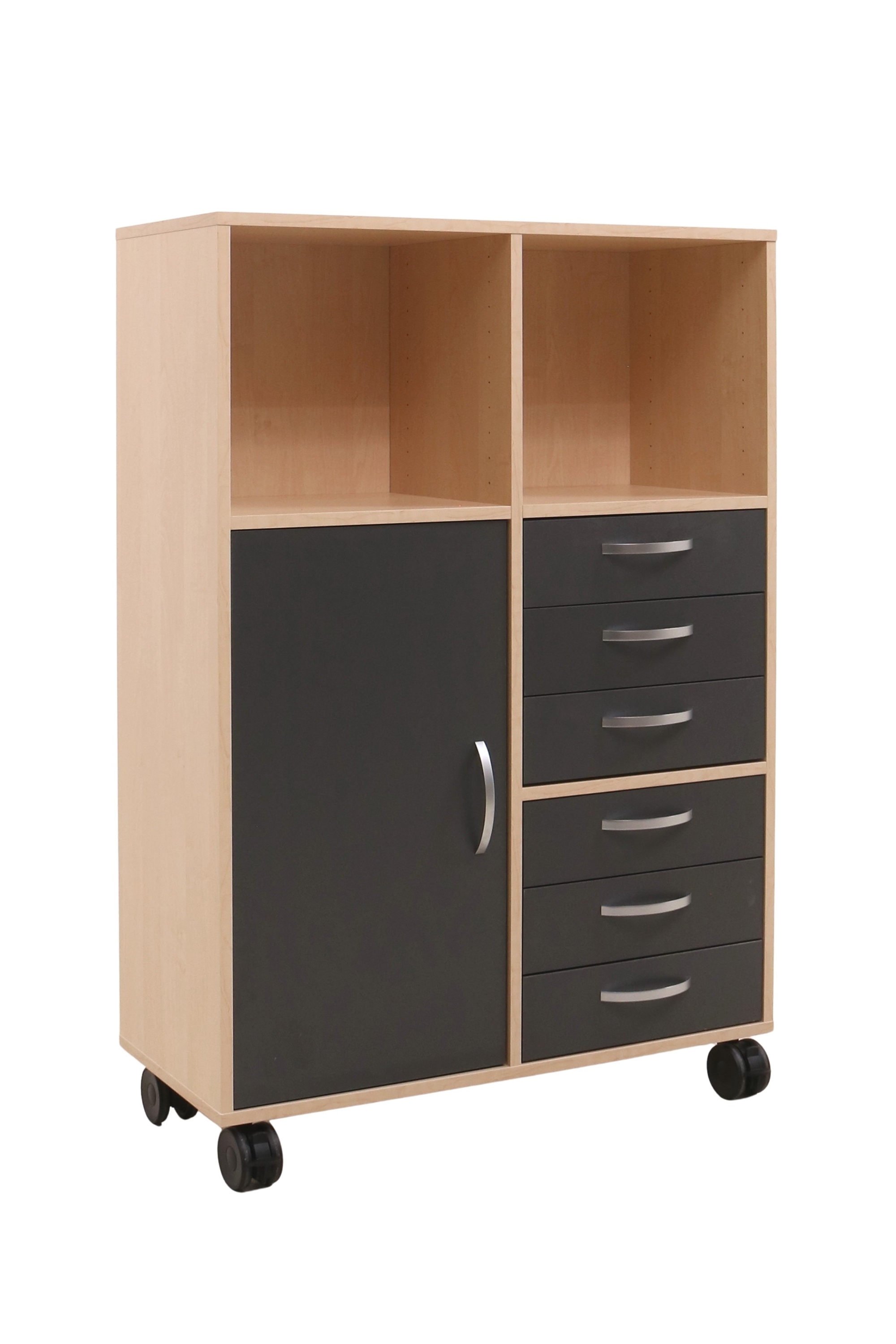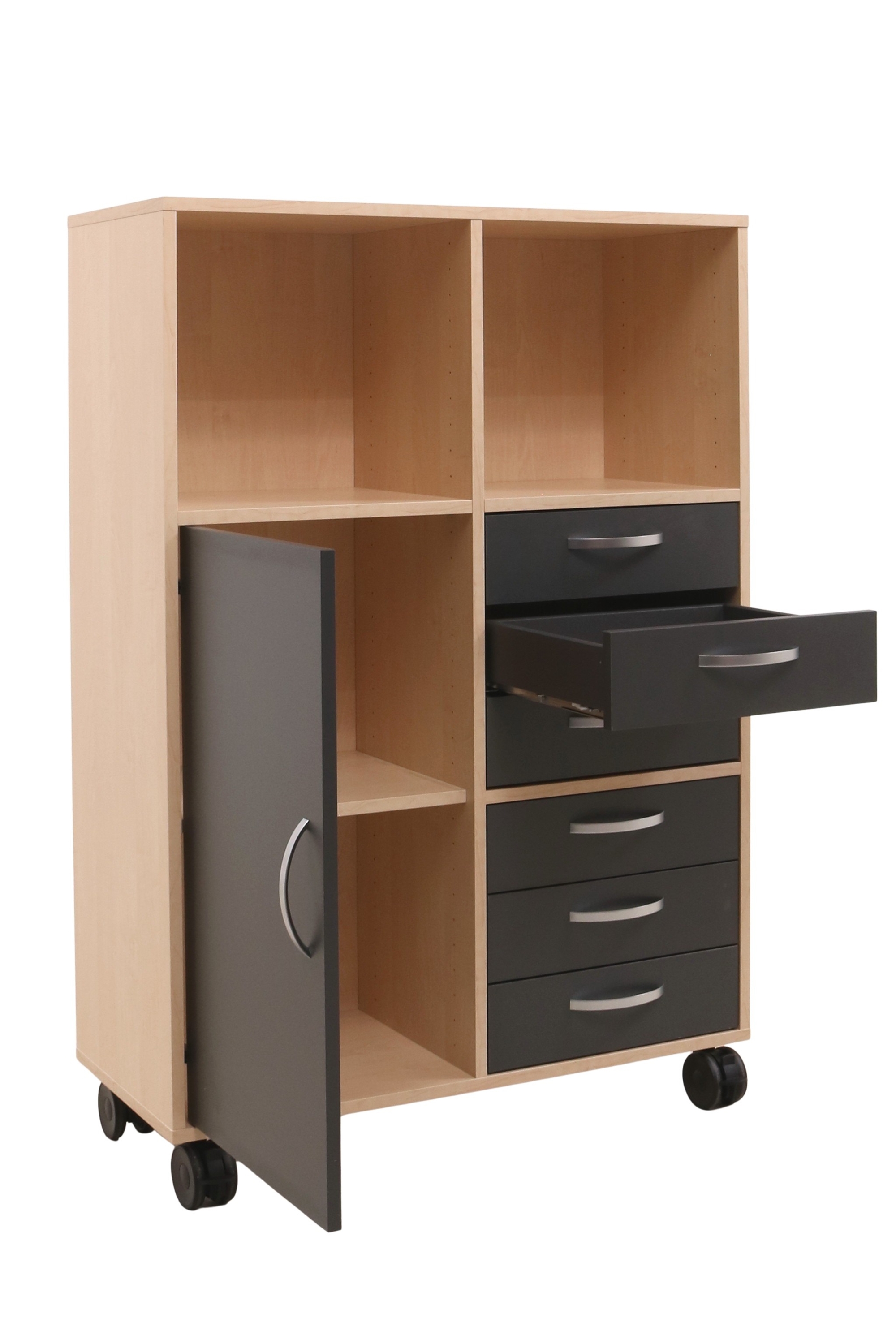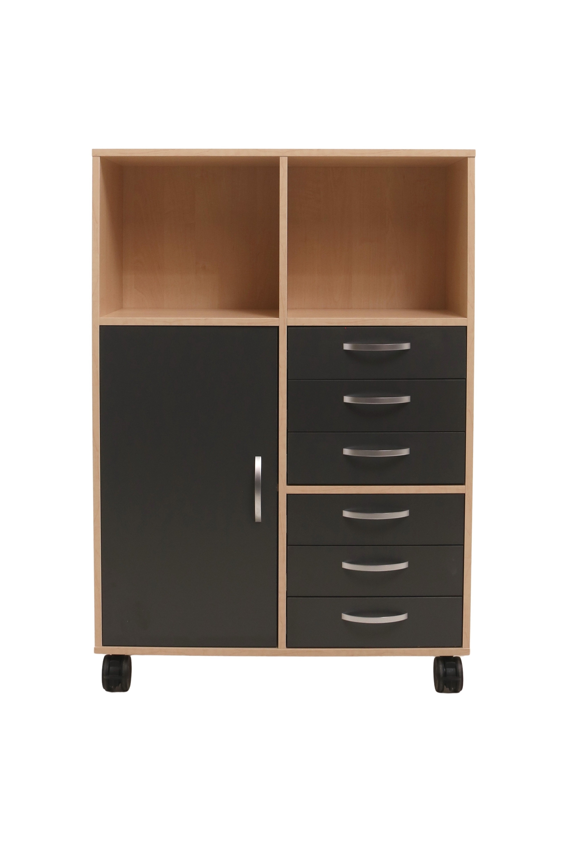 Moderne Jive reol i et pænt design fra Fumac i birk decor laminat med 6 rum (2x3) med 1 låge og 6 skuffer i antracit, som giver mange muligheder for opbevaring. Reolen har sorte gummibanehjul med lås.
