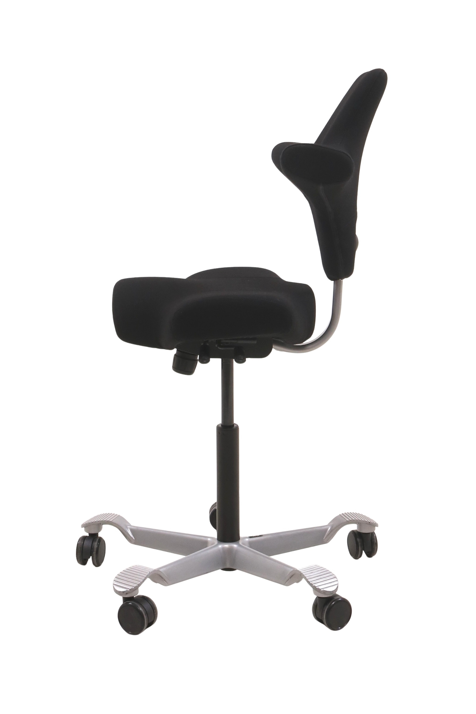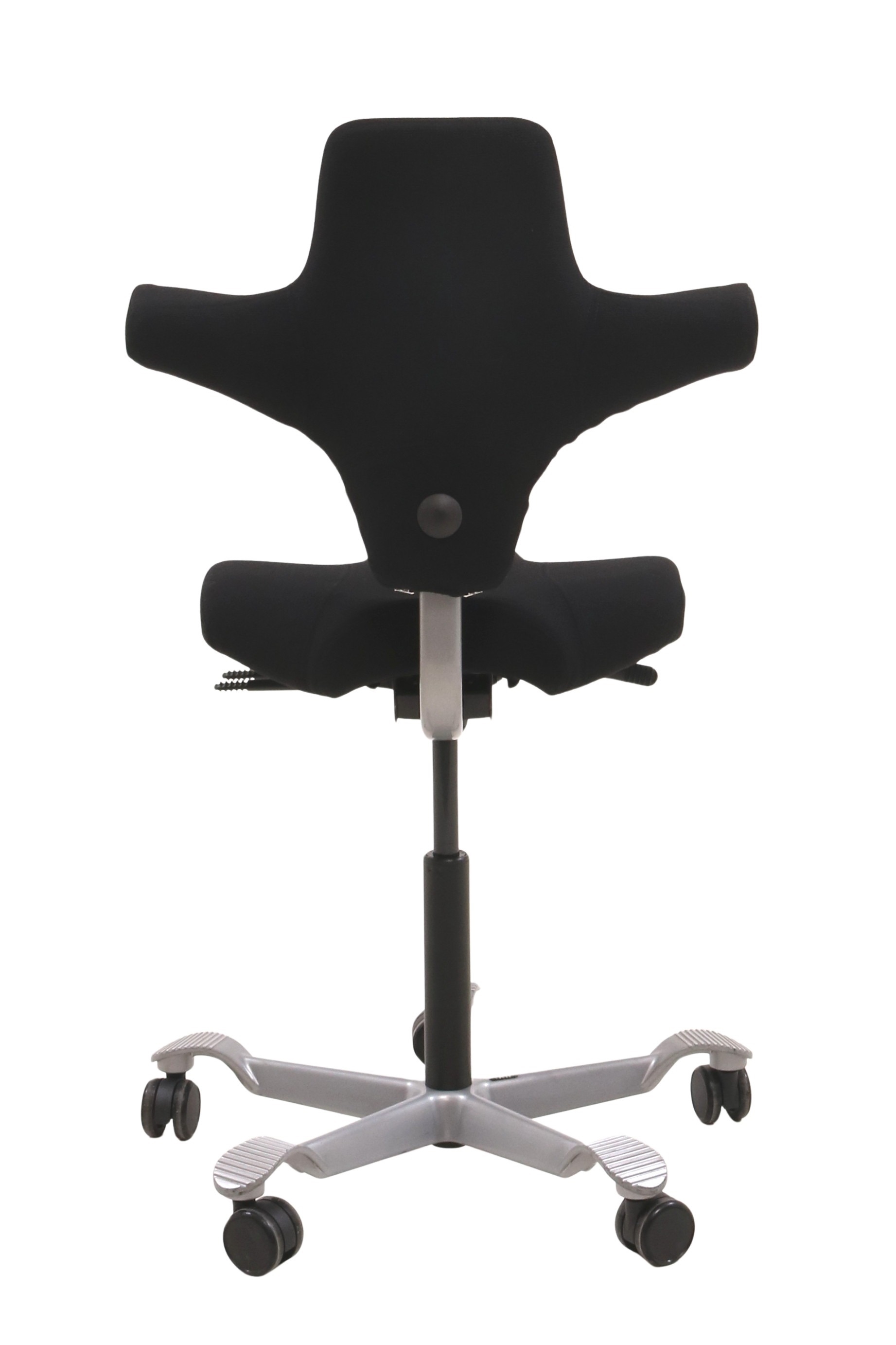 Håg Capisco 8106 kontorstol i sort set forfra.Håg Capisco 8106 kontorstol i sort set fra siden af.Håg Capisco 8106 kontorstol i sort set bagfra.Det sølvgrå fodkryds set tæt på.Knappen til højderegulering af ryggen set tæt på.Det sorte fame stof set tæt på.