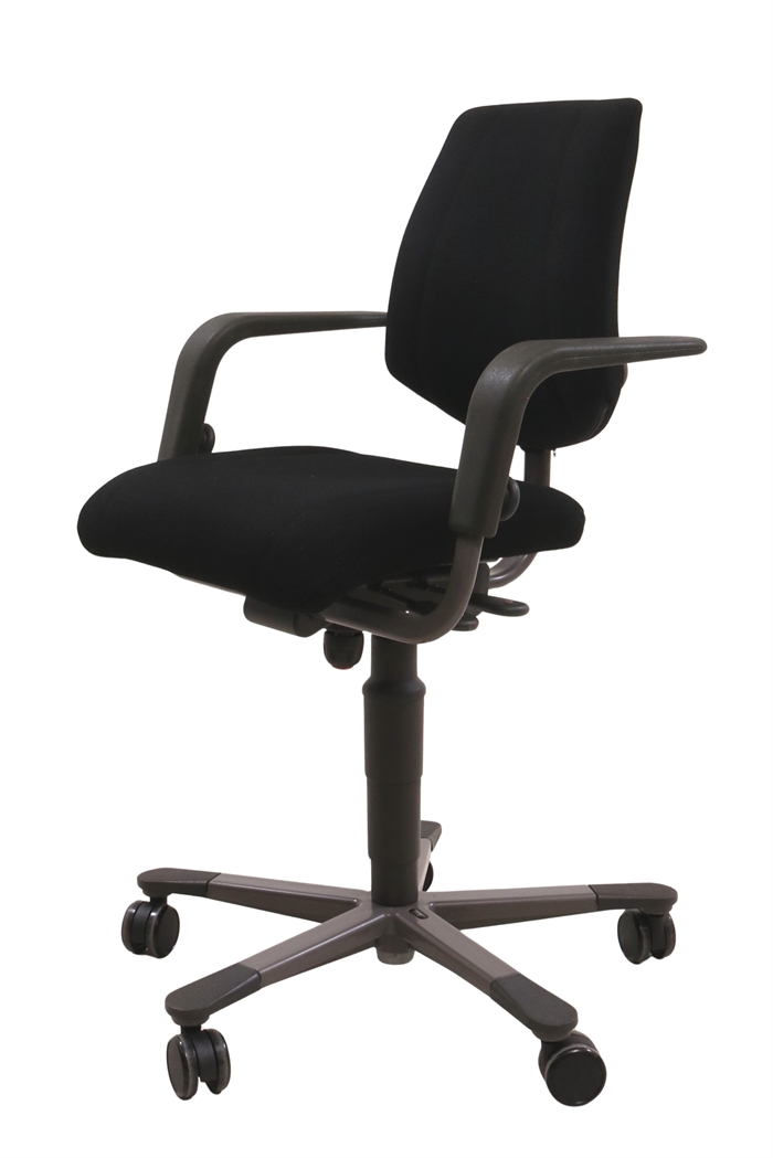 Håg H03 Credo 3300 er en klassisk kontorstol, som giver en god siddekomfort. Denne model er med sort stof og sort fodkryds. Stollen er med justerbare armlæn der sikre en behagelige siddestilling. Kontorstolen er med fabriks nye sorte gummibanehjul.
