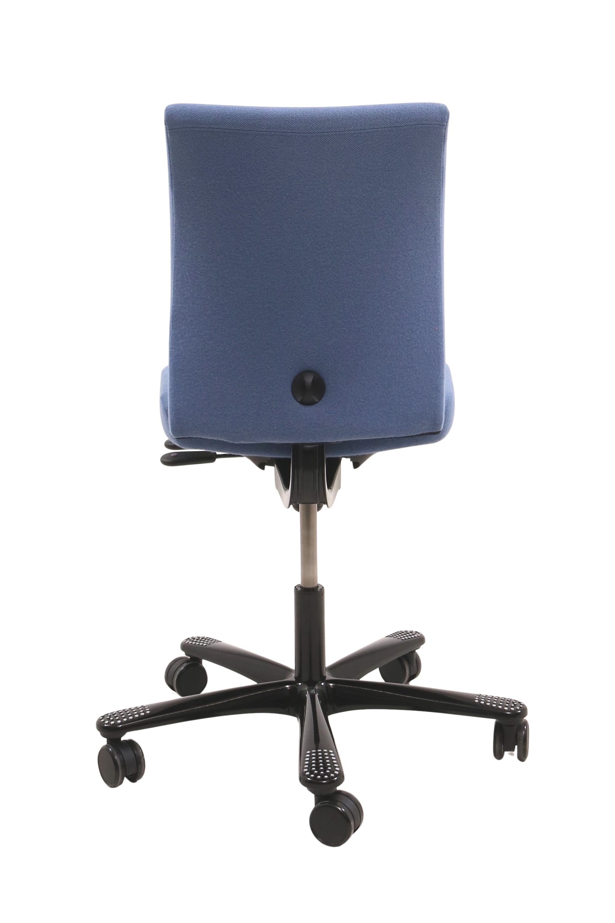 Håg H04 4200 kontorstol i mellem blå set forfra.Håg H04 4200 kontorstol i mellem blå set fra siden af.Håg H04 4200 kontorstol i mellem blå set bagfra.Det sorte fodkryds set tæt på.Justeringsknap på ryggen set tæt på.Det mellemblå fame stof set tæt på.