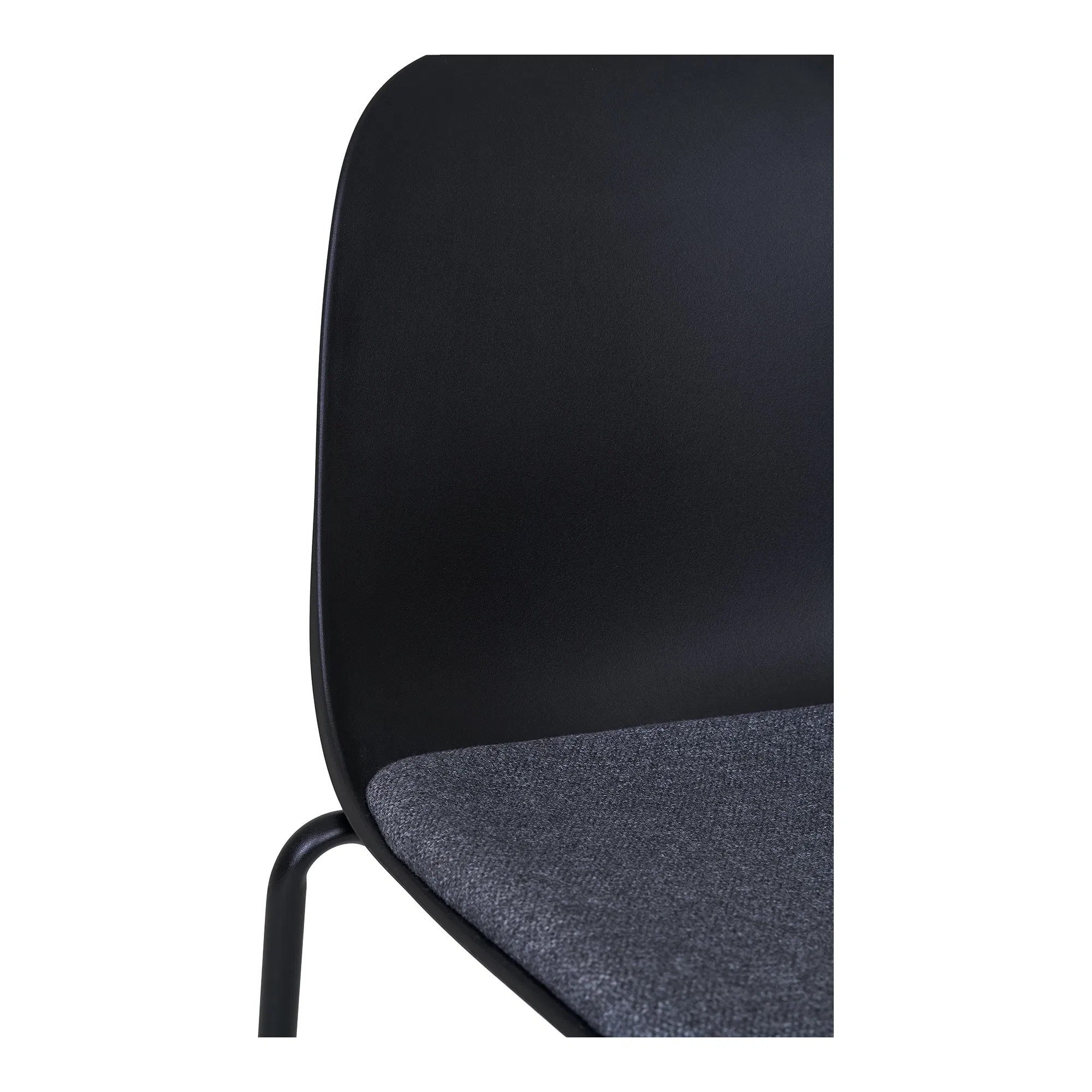 Spisebordsstol i formstøbt plast med metal ben alt i sort. Stolen er udført i et klassisk design med fuldtbetrukket sæde og tynde, elegante ben.
