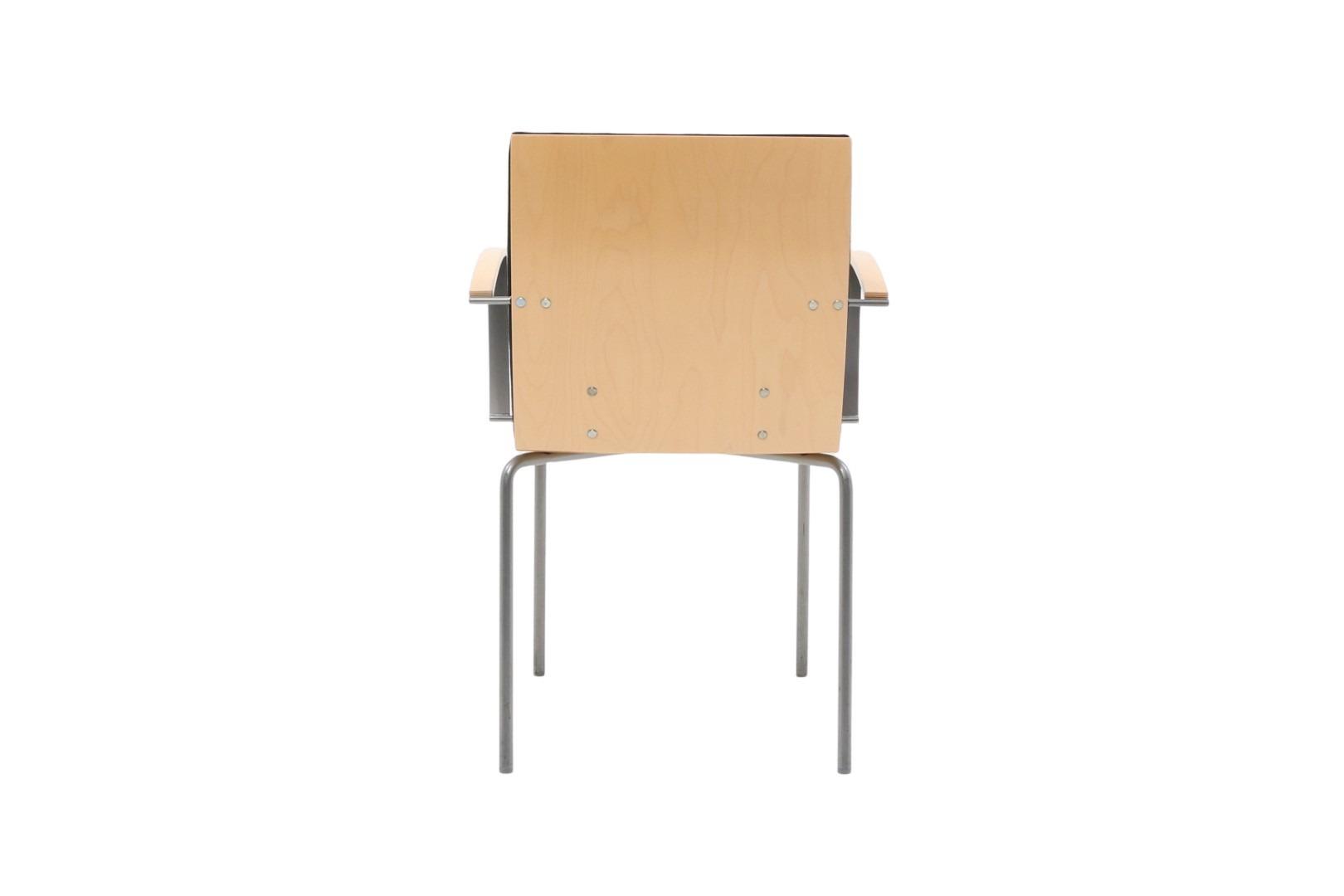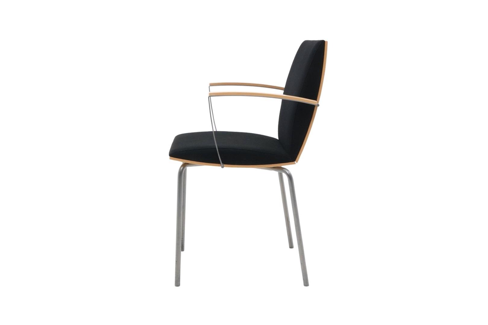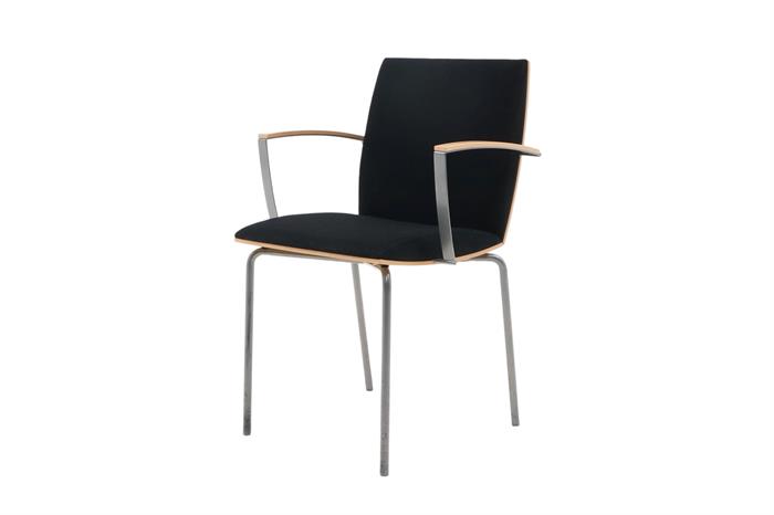 Flot Mødestol i et stilrent Nordisk design. Armlæn, sæde & ryg er i massiv formspændt birke finer, i en god kvalitet fra Isku i Finland. Sæde & ryg har en god polstring. Stof farve sort. Stolen har en god siddekomfort og er velegnet til længere møder hvor ønsket er, at sidde behageligt.