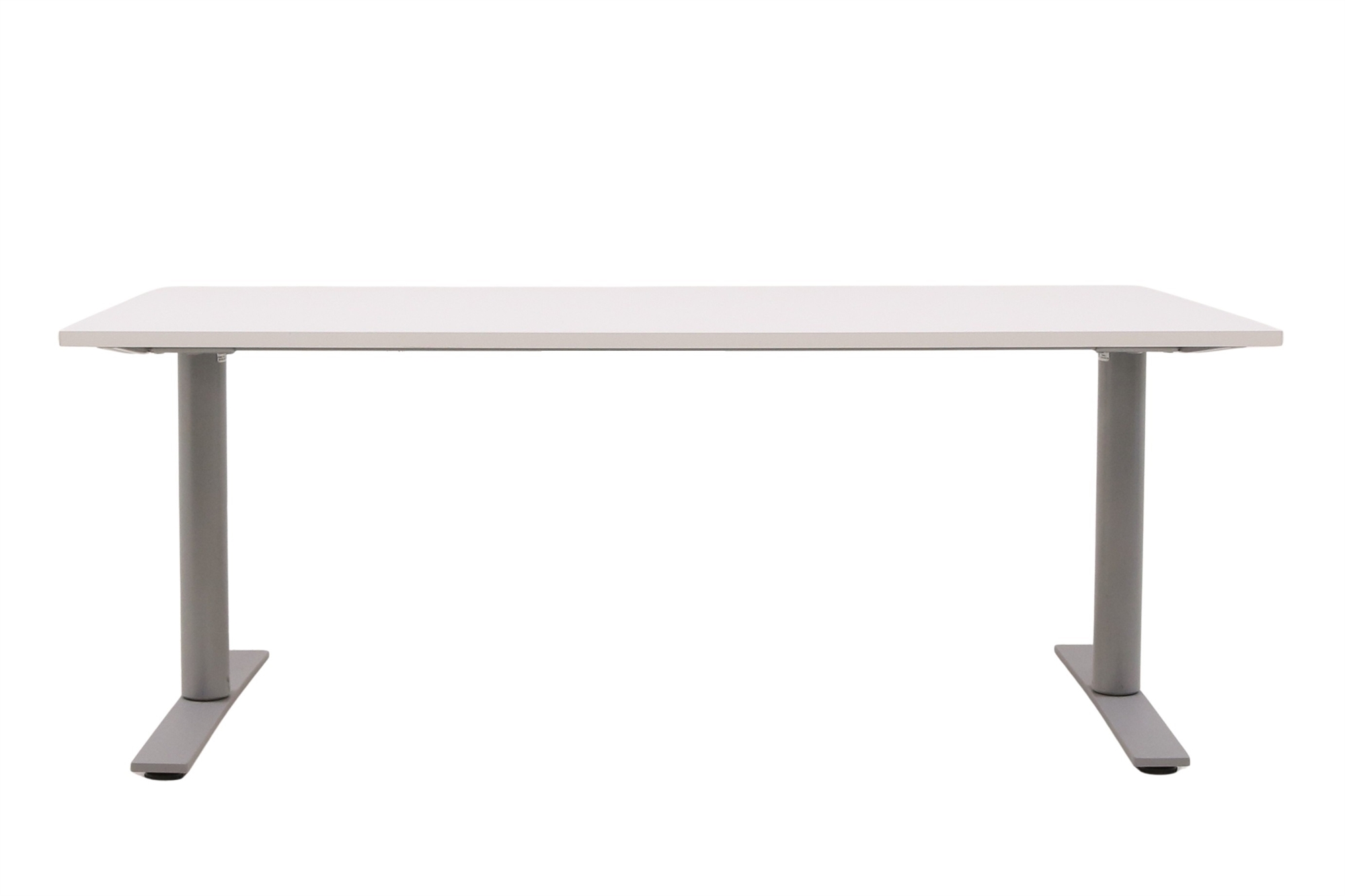 Hæve sænkebord i hvid med sølvgråt stel set forfra i en skrå vinkel.