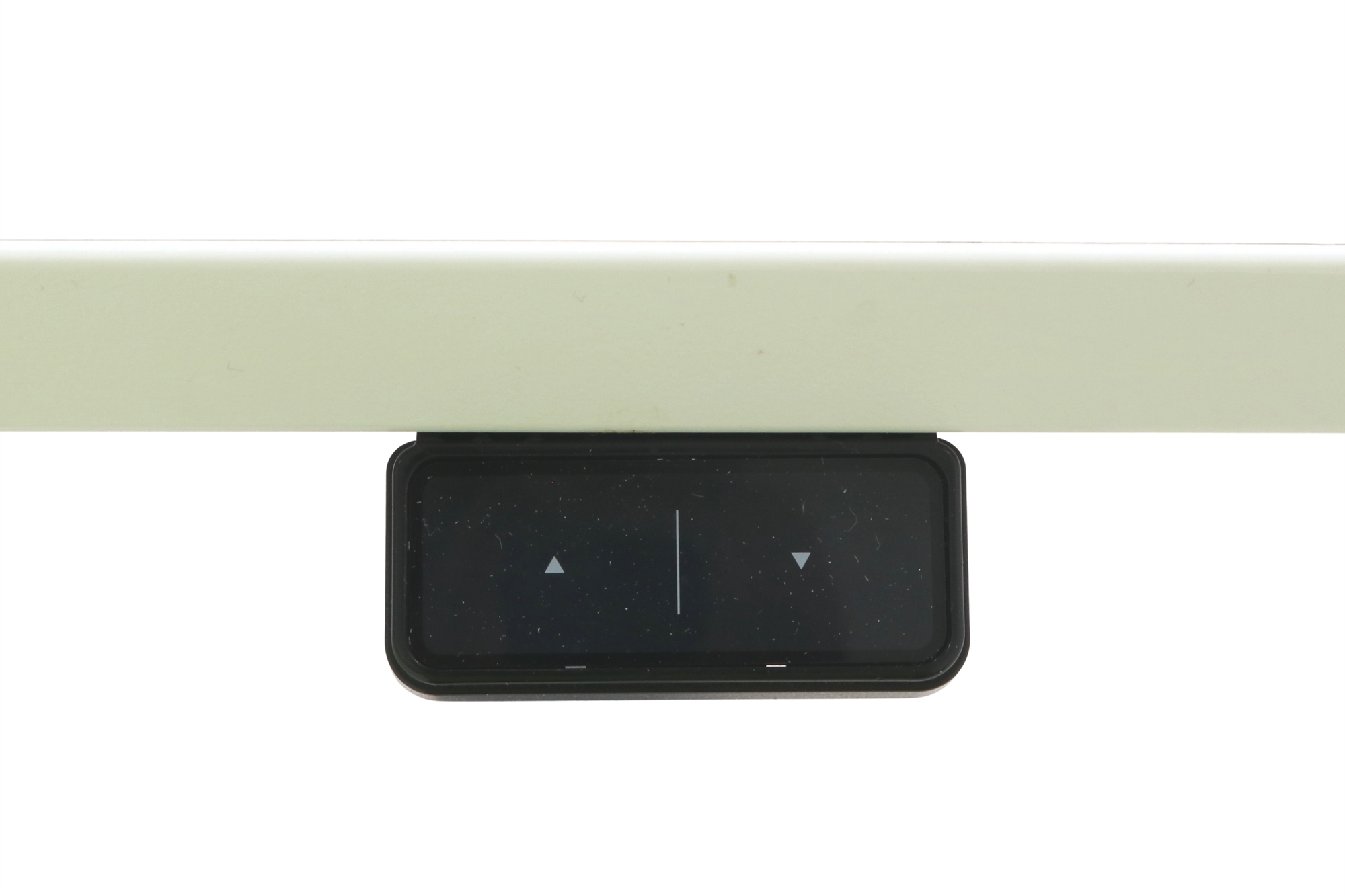 Hæve sænkebord i hvid med sølvgråt stel set forfra.Hæve sænkebord i hvid med sølvgråt stel set fra siden af.Hæve sænkebord i hvid med sølvgråt stel set bagfra.Betjeningspanelet set tæt på.Den hvide laminat set tæt på.