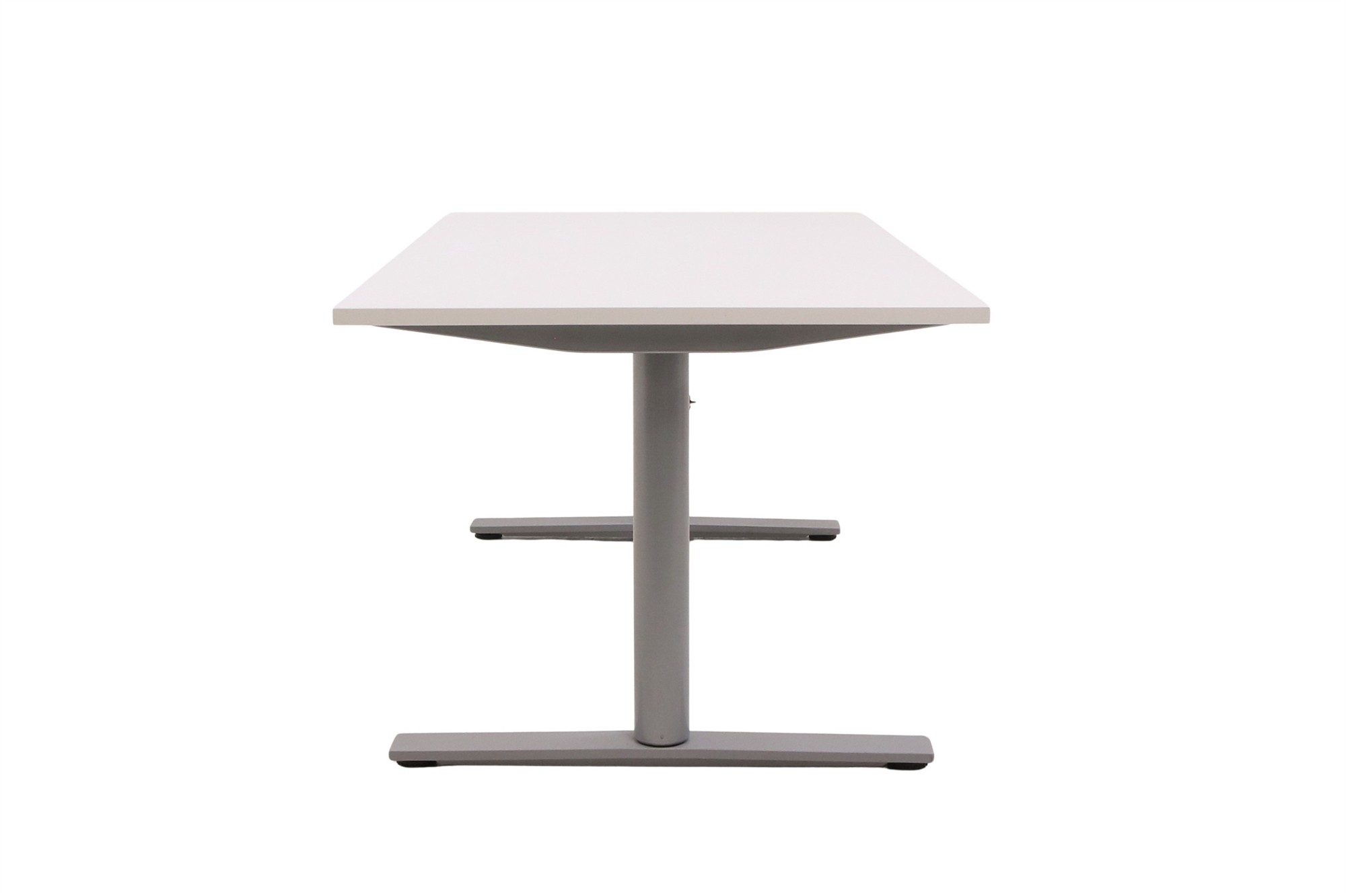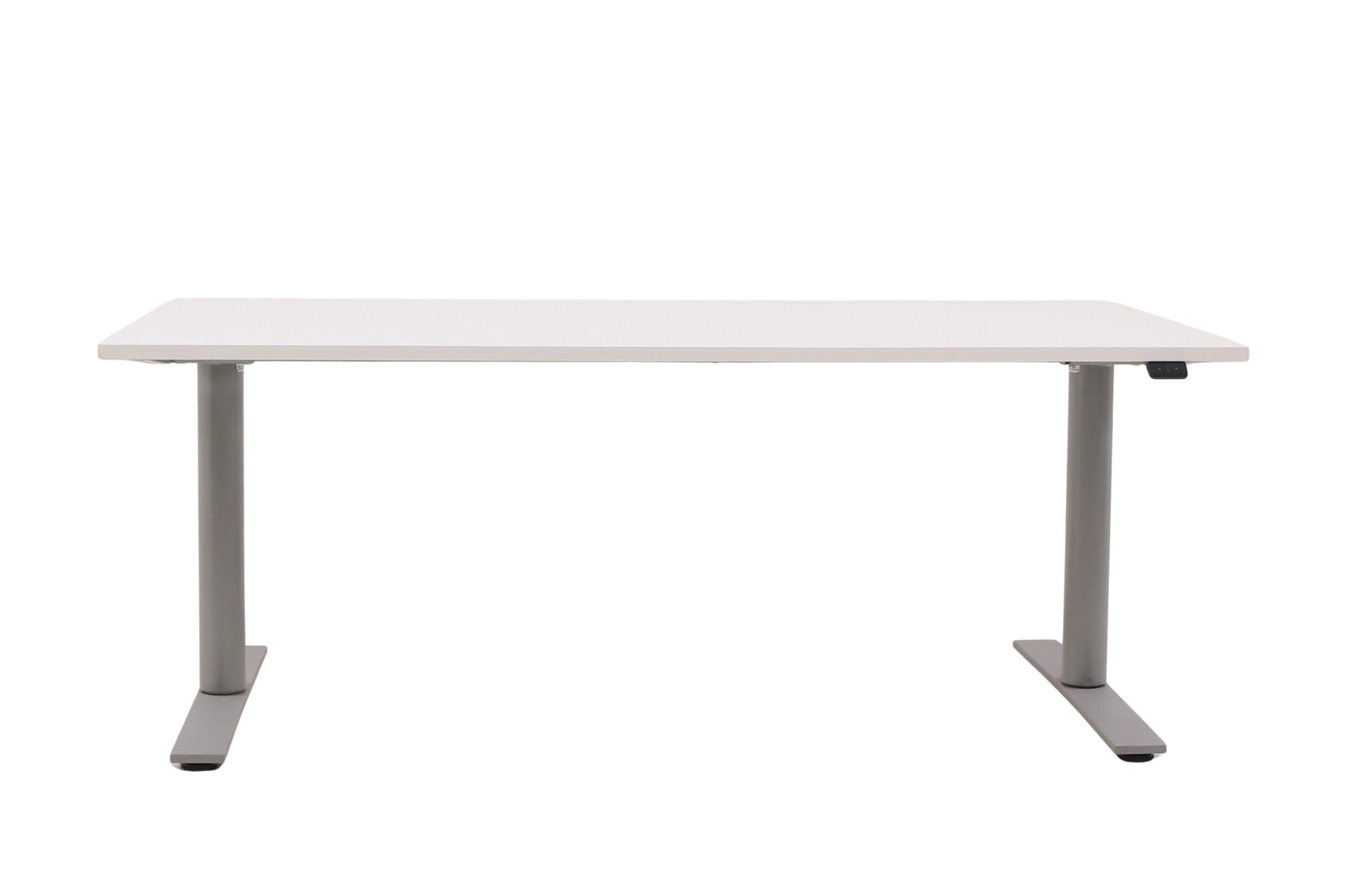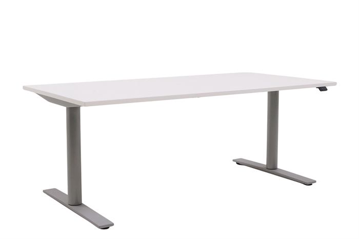 Hæve sænkebord i hvid med sølvgråt stel set forfra i en skrå vinkel.