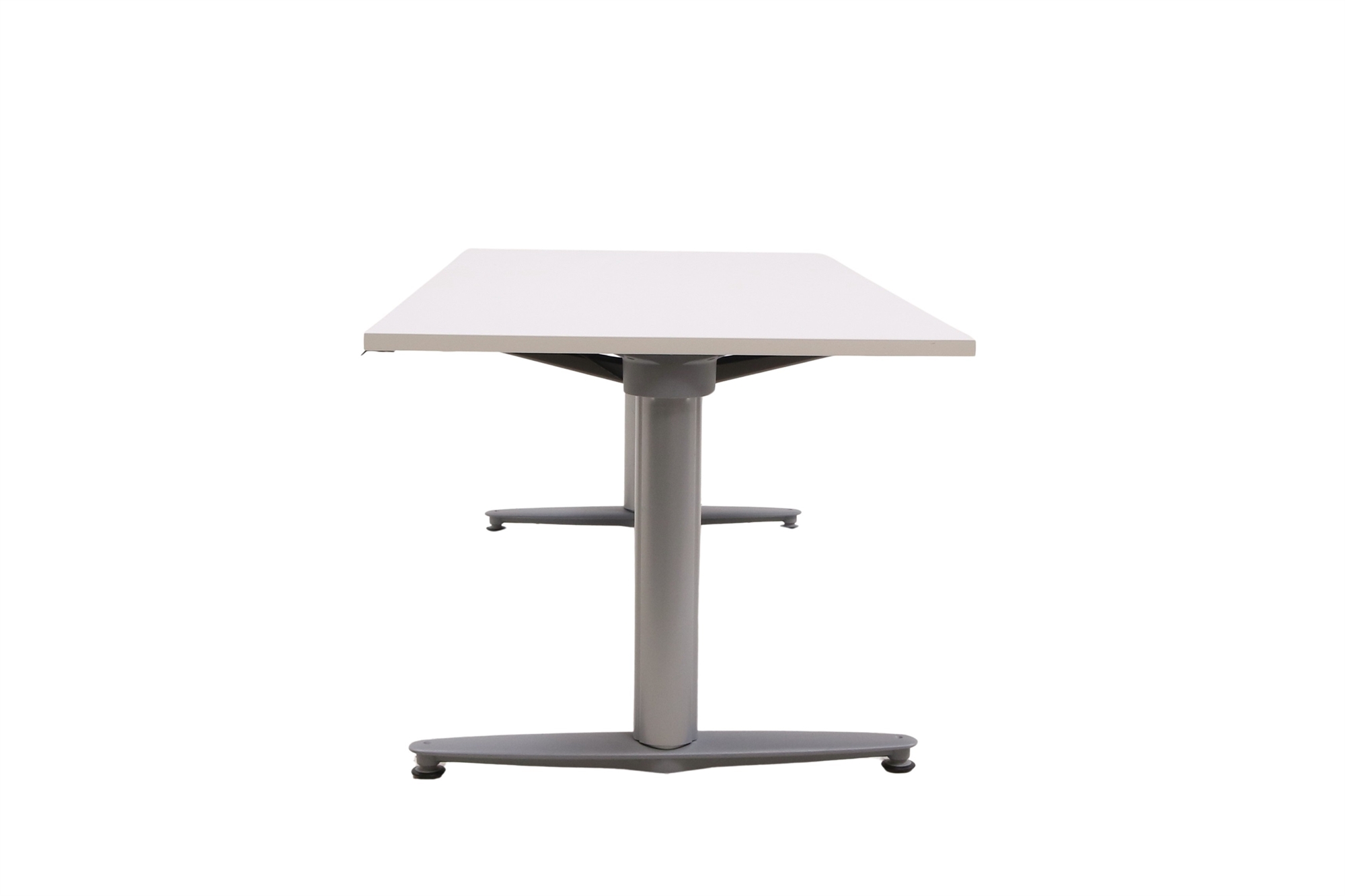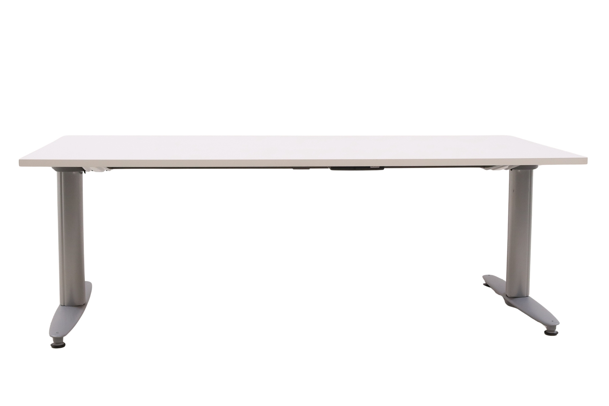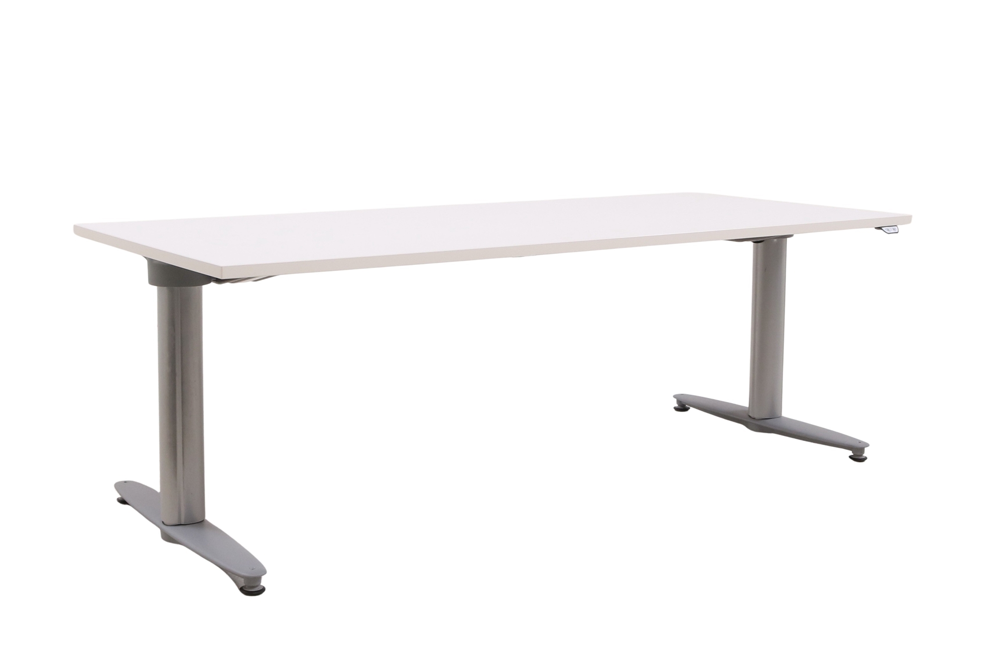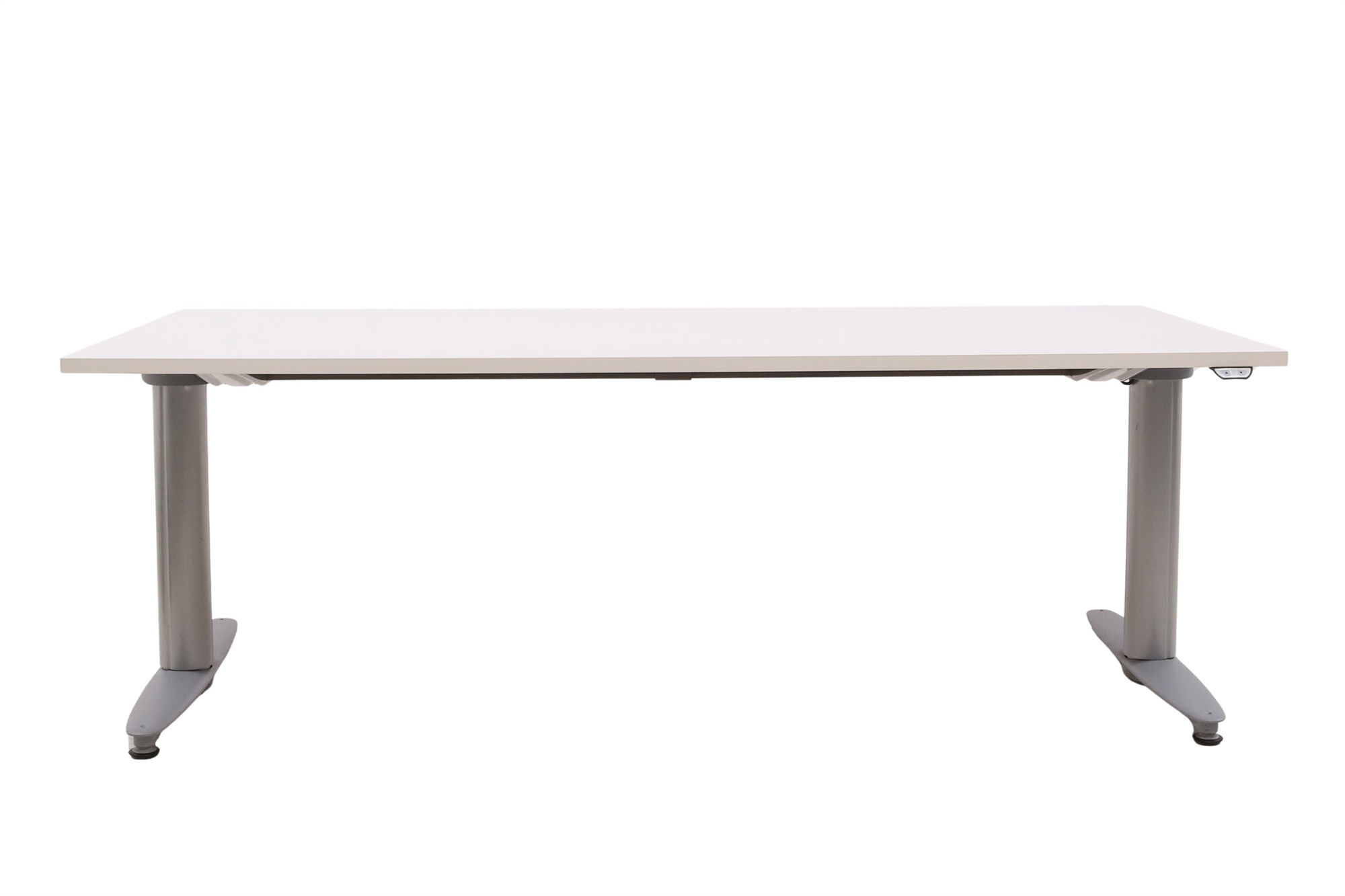Hæve sænkebord i hvid med sølvgråt stel set forfra i en skrå vinkel.
