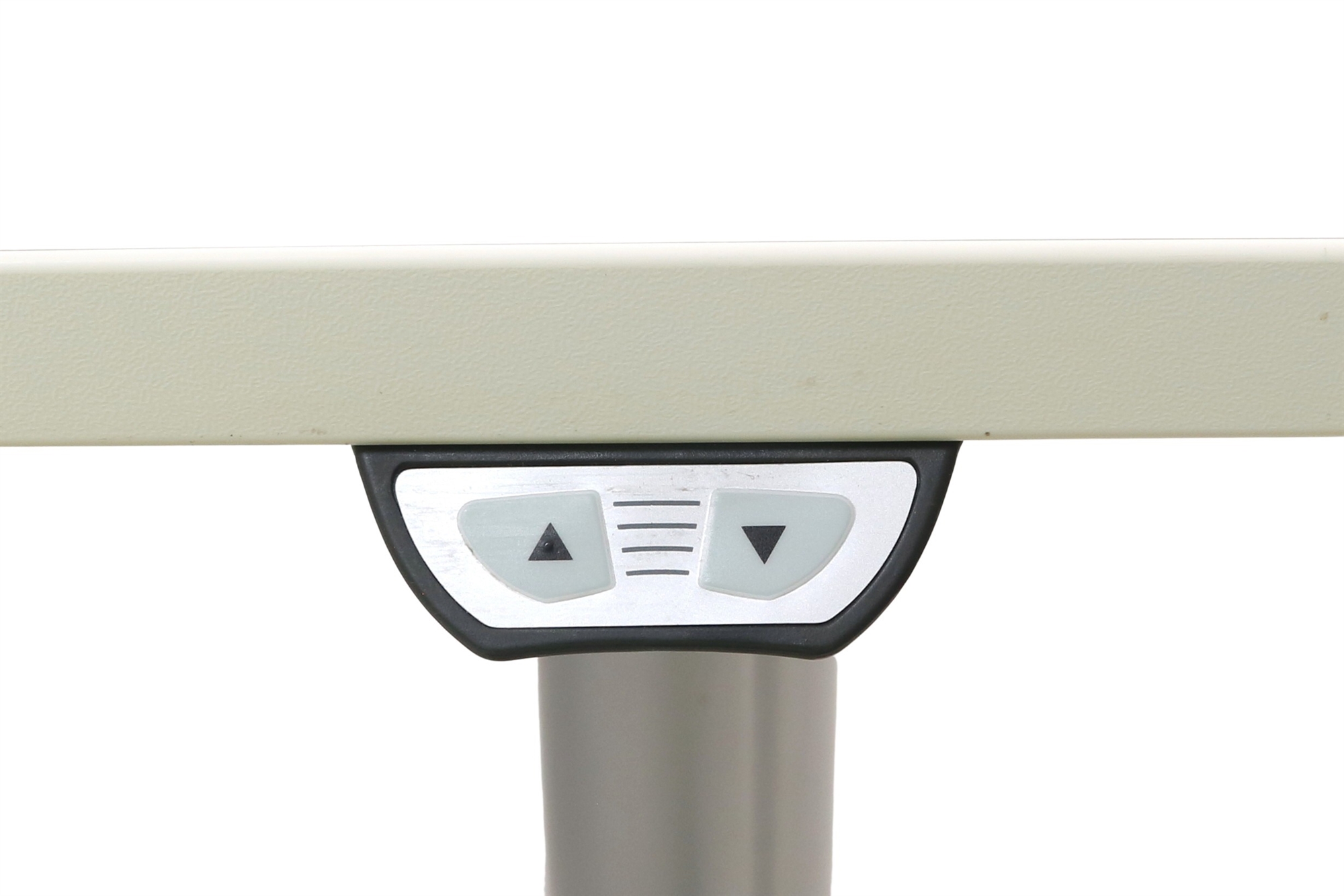 Hæve sænkebord i hvid med sølvgråt stel set forfra.Hæve sænkebord i hvid med sølvgråt stel set fra siden af.Hæve sænkebord i hvid med sølvgråt stel set bagfra.Betjeningspanelet set tæt på.Den hvide laminat bordplade set tæt på.
