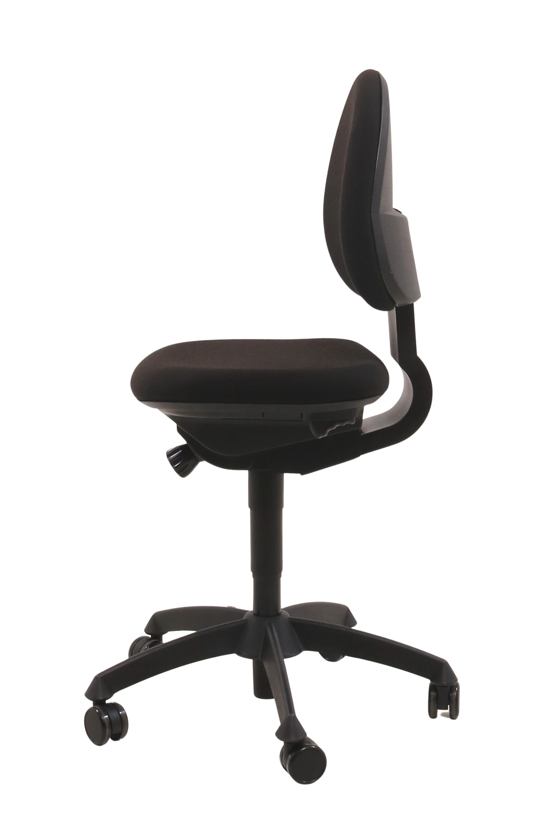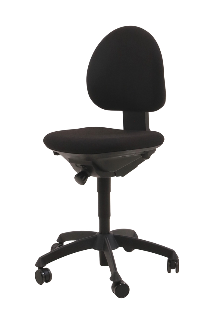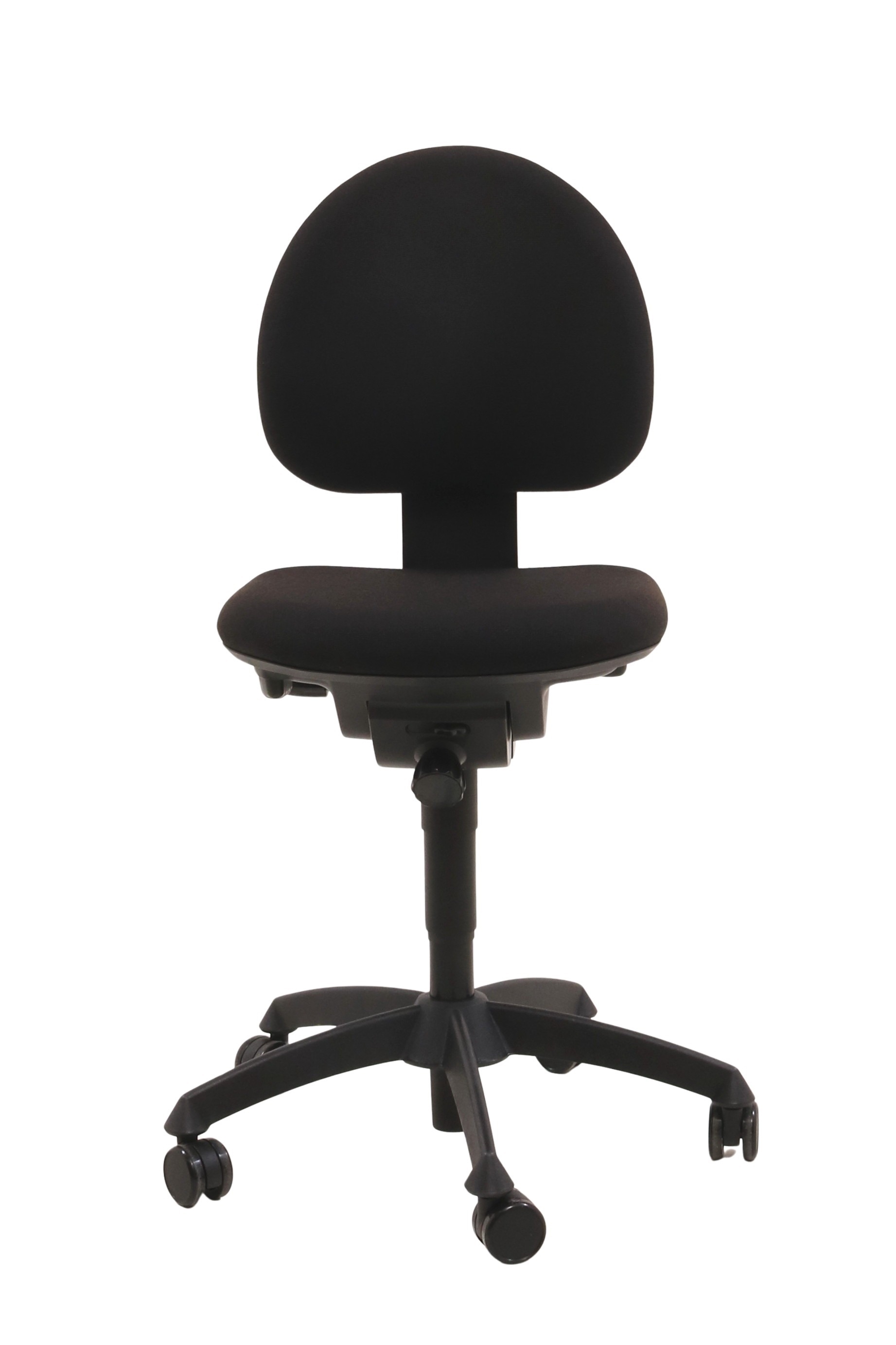 Labofa kontorstol i sort set forfra i en skrå vinkel.