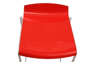 Den røde barstol set forfra.Den røde barstol set fra siden af.Den røde barstol set bagfra.Den røde barstol set forfra oppefra.Det røde højglans polerede glasfiber sæde set tæt på.