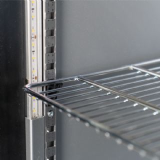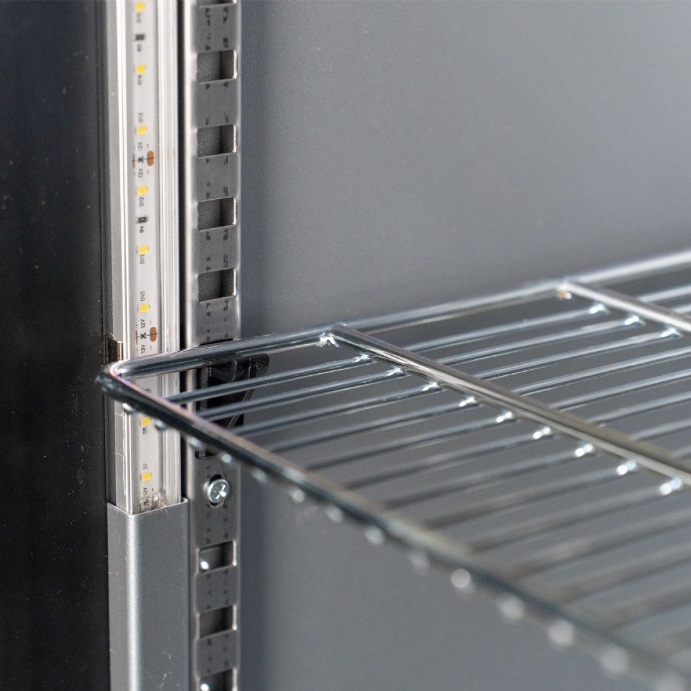 Fantastisk produktpræsentation|Lavt energiforbrug|Skinplate eksteriør/interiør|Ideel til dekorering|Vendbar glasdør|Justerbare trådhylder|Indvendigt LED-lys med kontakt|Justerbare ben|Digital kontrol og temperatur-display|Automatisk afrimning|Mobil ramme fås som tilbehør