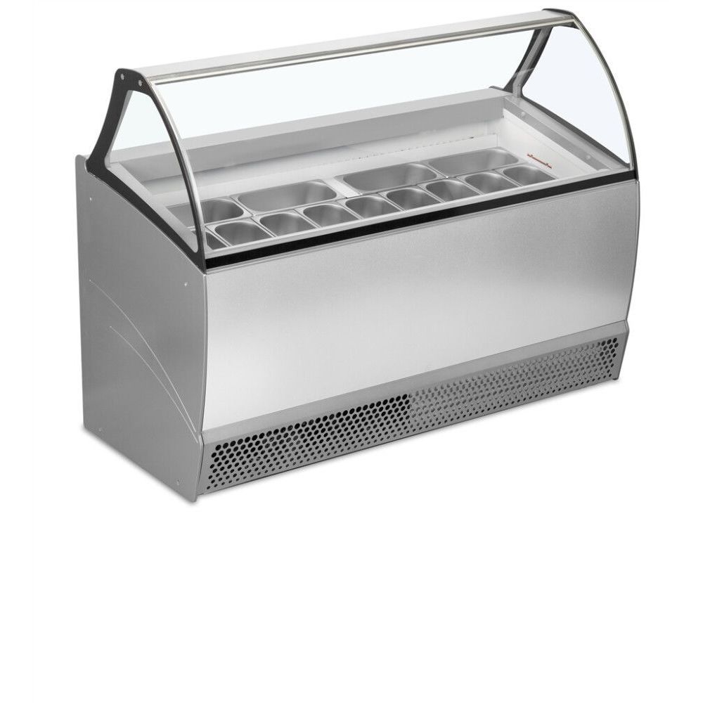 Bermuda er en serie af display isdiske, der fås i to størrelser med plads til enten 10 eller 13 Napoli iskantiner. Fryseren er udstyret med ventileret køl, der sikrer, at isen har den perfekte serveringstemperatur, uanset om du serverer italiensk is eller flødeis. Der er et indbygget lagerrum forneden. Det buede glasparti er både elegant og praktisk med varmetråde i glasset, hvilket forebygger kondensvand. Med en attraktiv kombination af kvalitet og en konkurrencedygtig pris, er den et populært valg.