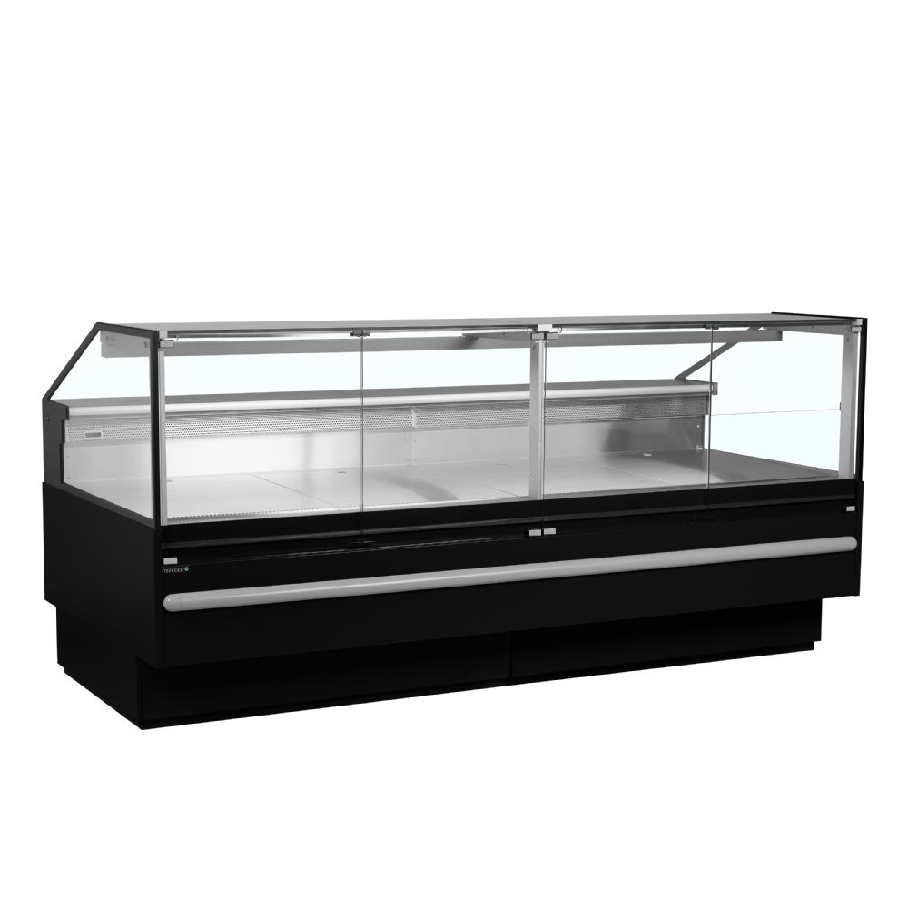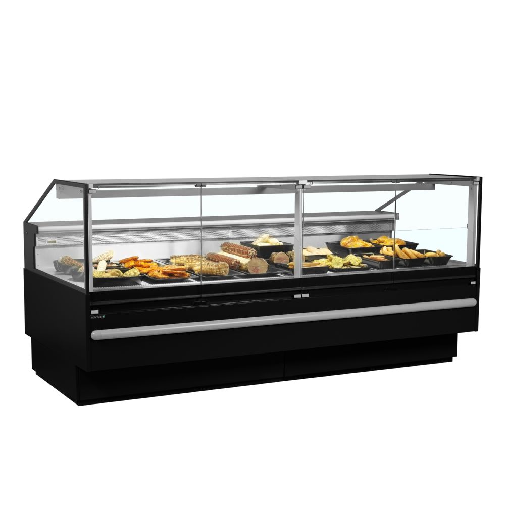 Sort design|Fremragende produktsynlighed|825 mm dyb dækplade i rustfrit stål|Frontglas med anti-kondens|Glasfront åbnes udad fortil for nem rengøring|Rustfri stålhylde på bagsiden|Ventileret køling|Temperaturklasse 3M1|LED toplys|2 x 220-240V stikkontakter på bagsiden|Multiplexing-sæt er tilbehør|Fenderlister