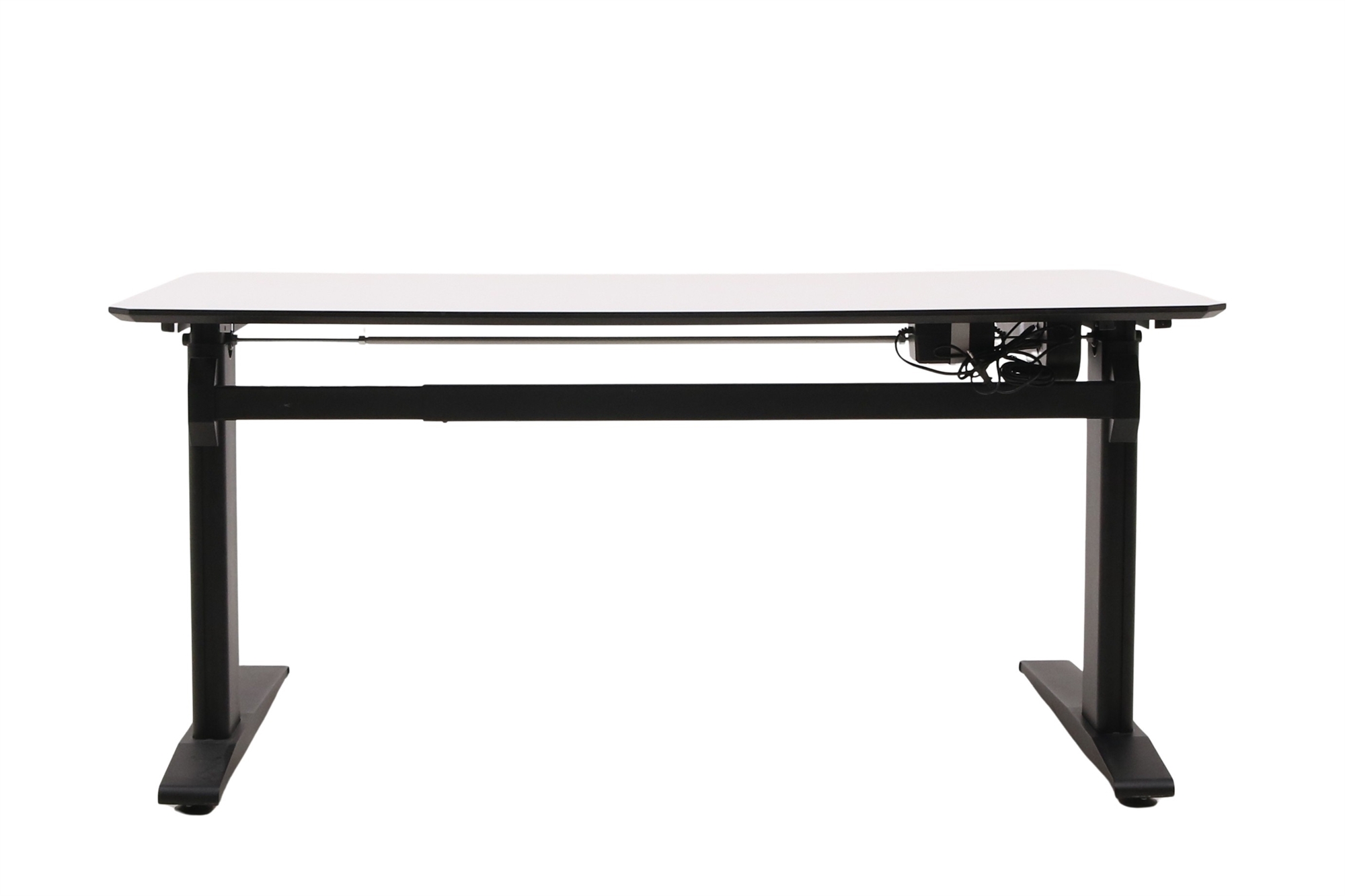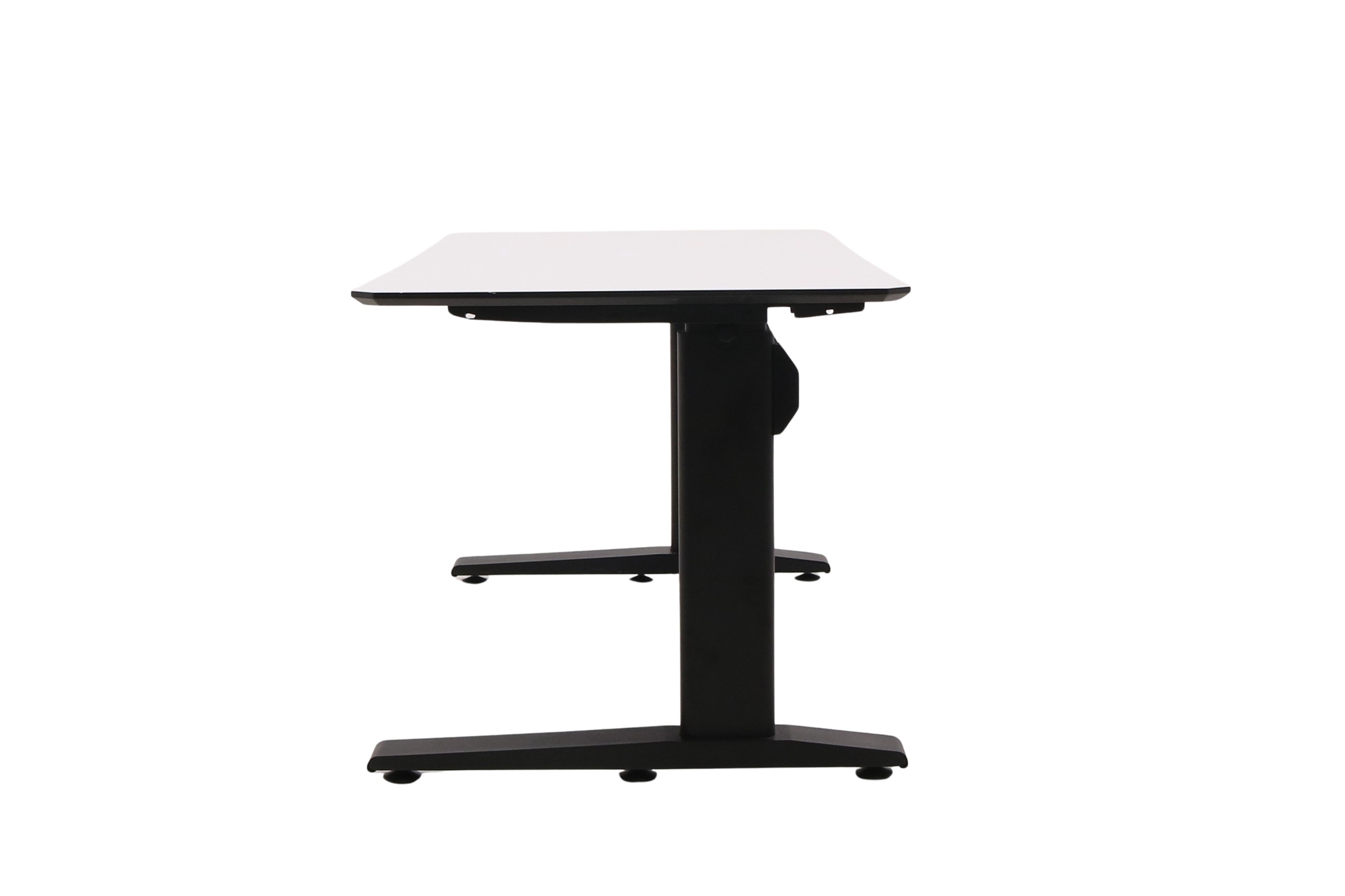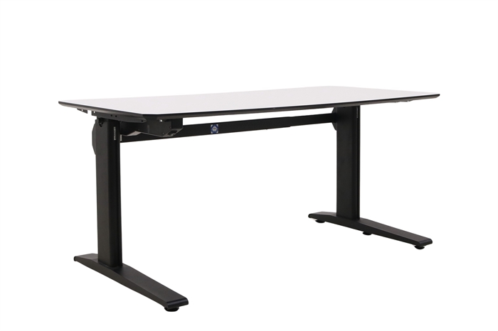 Hæve sænkebord i hvid med sort stel set forfra i en skrå vinkel.