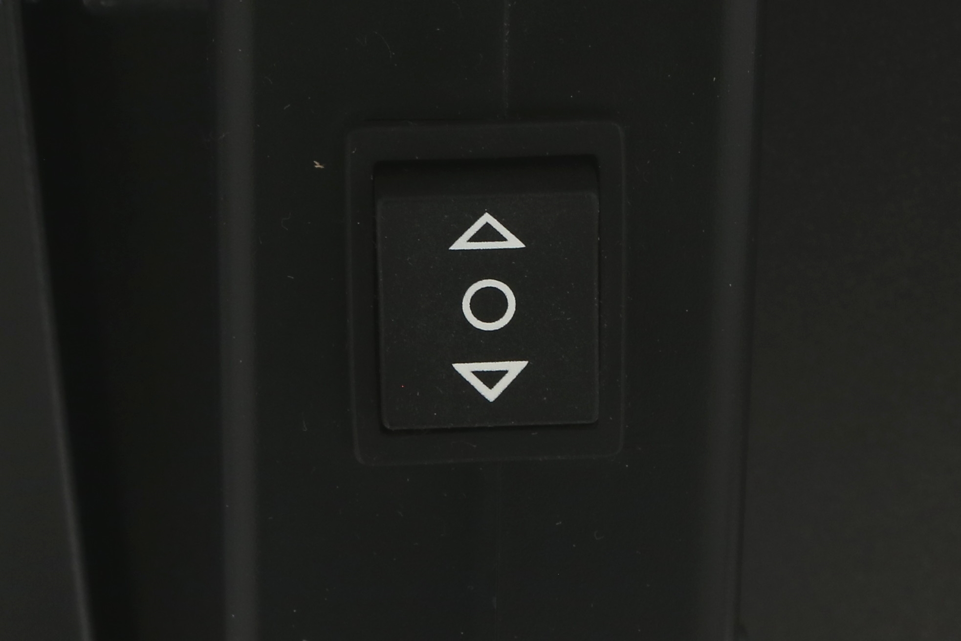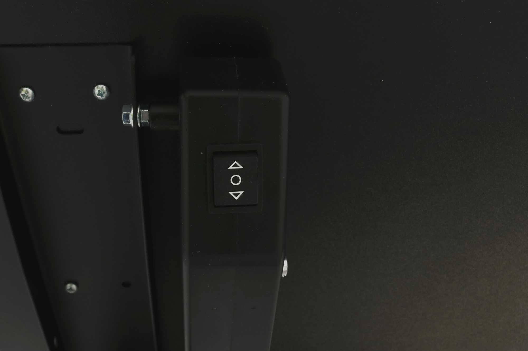 Hæve sænkebord i hvid med sort stel set forfra.Hæve sænkebord i hvid med sort stel set fra siden af.Hæve sænkebord i hvid med sort stel set bagfra.Betjeningsknappen set tæt på.Betjeningsboksen med knap set tæt på.Den hvide decor laminat set tæt på.