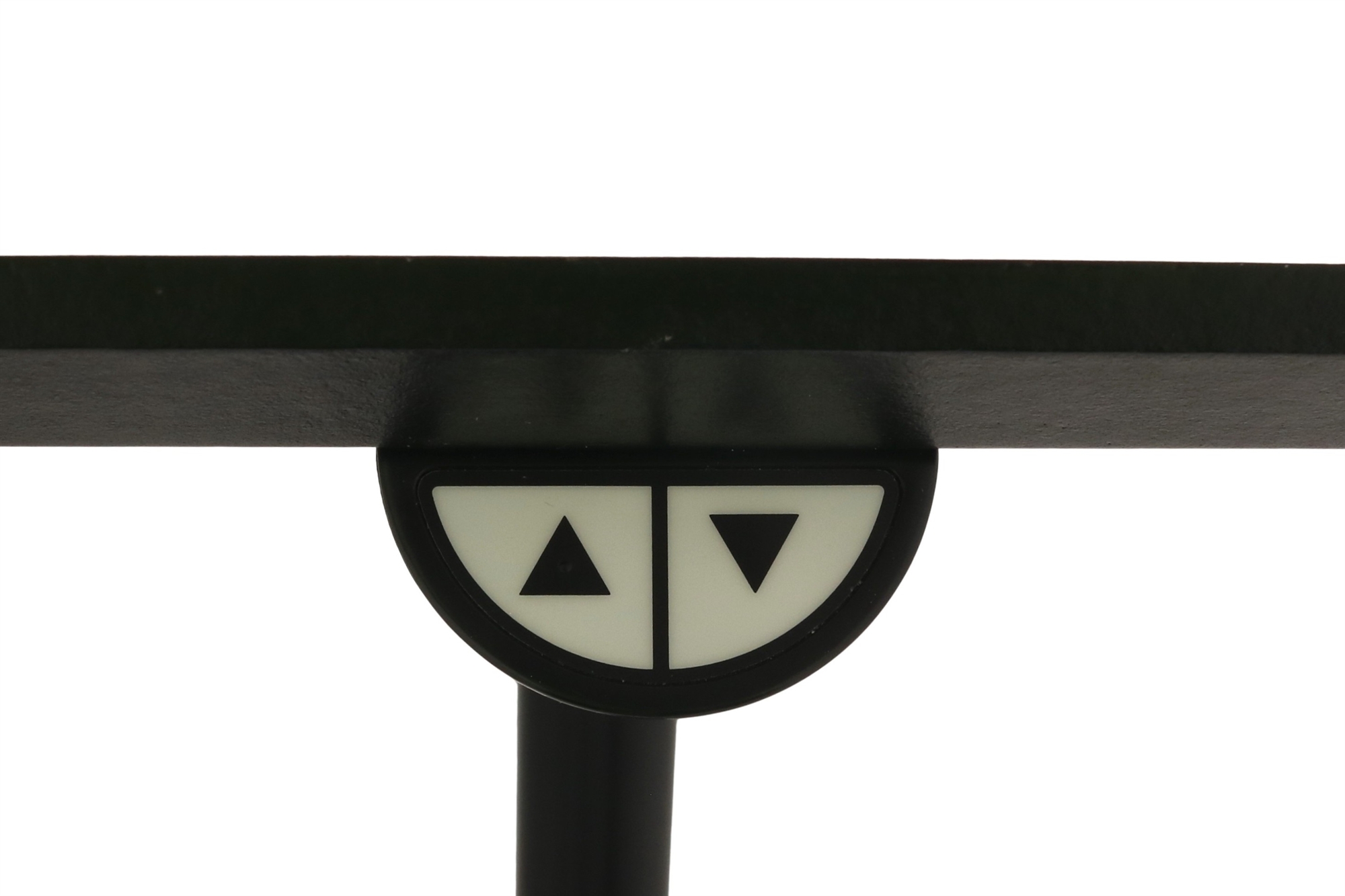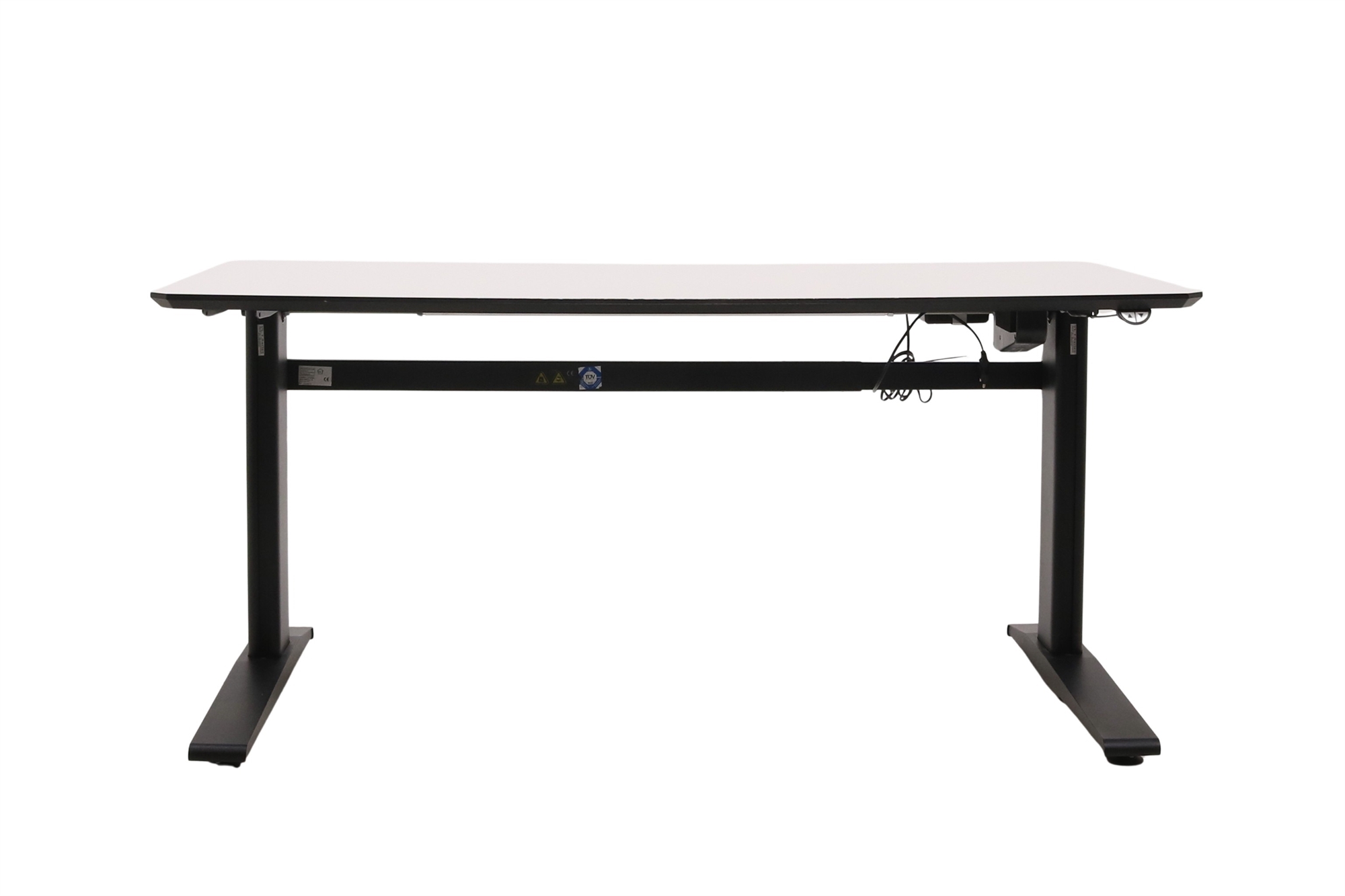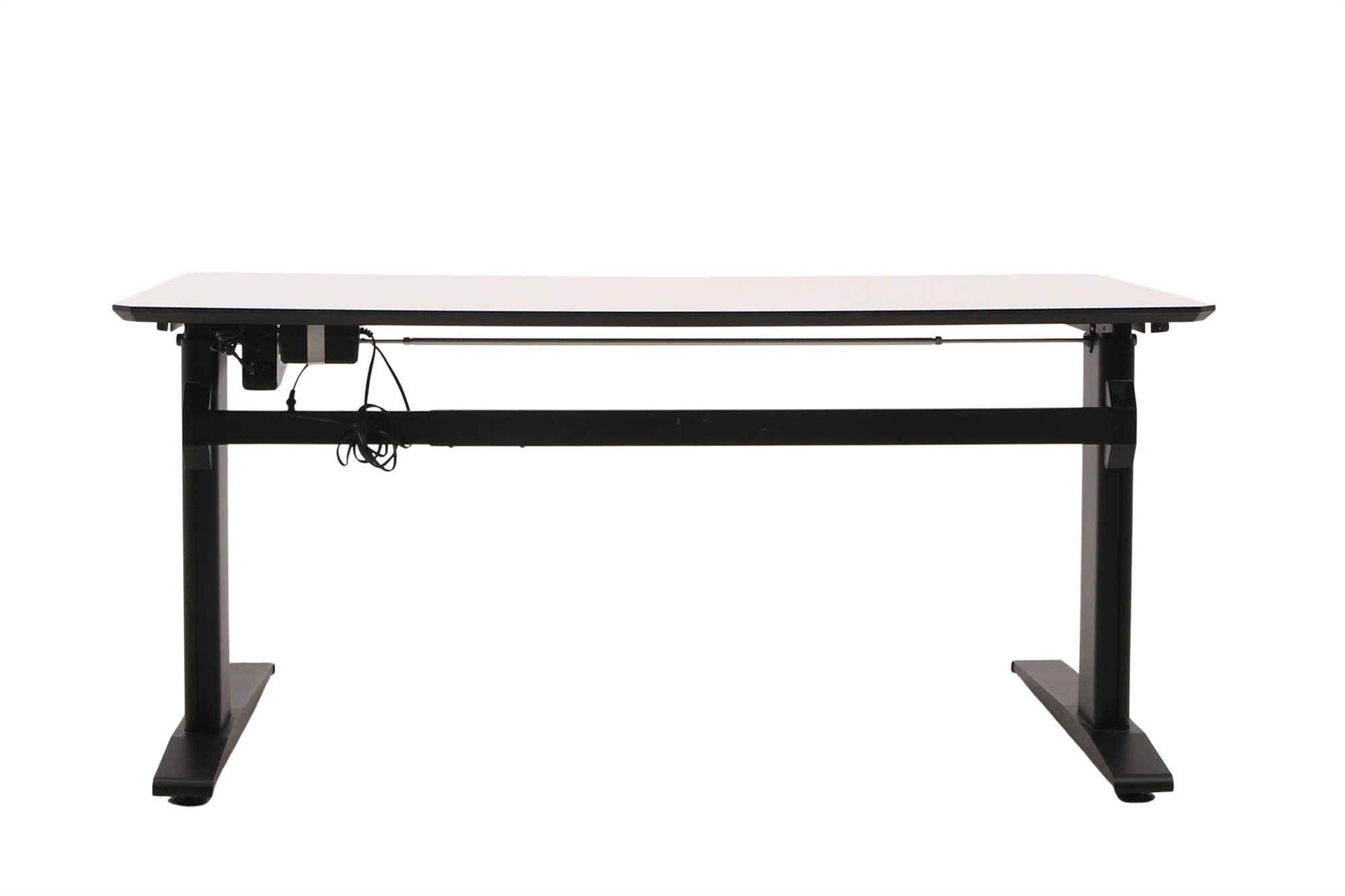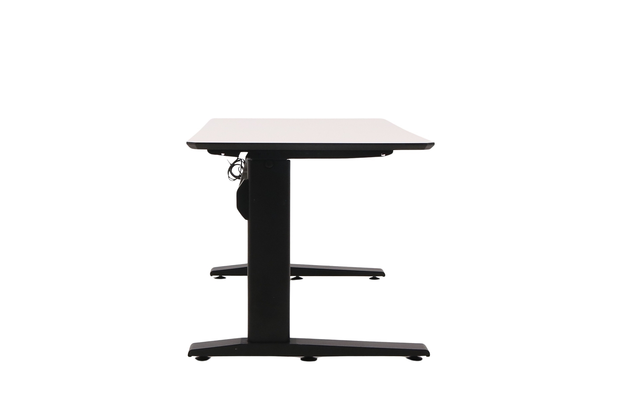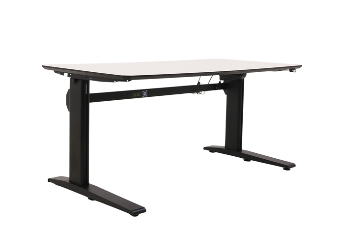 Hæve sænkebord i hvid med sort stel set forfra i en skrå vinkel.