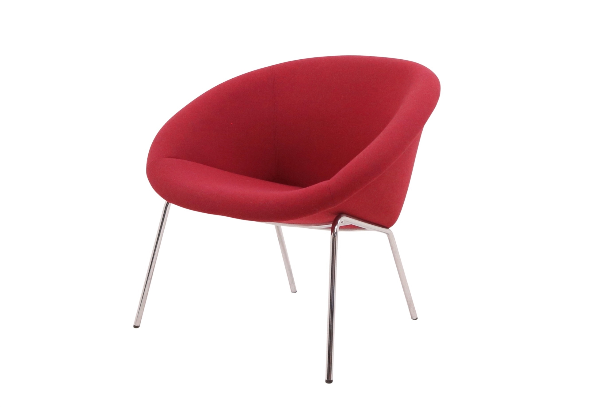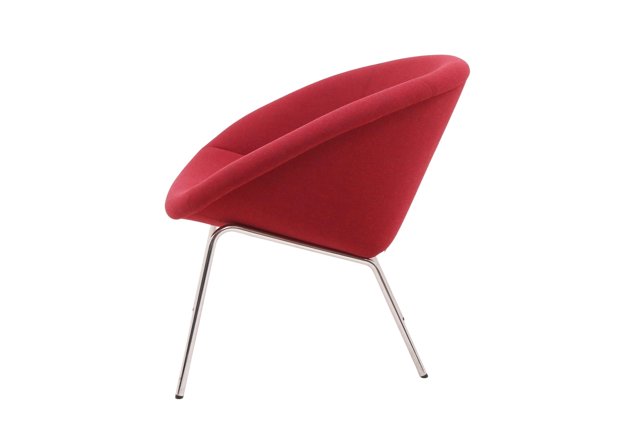 Stolen er udført i et design der understøtter den gode siddekomfort. Loungestol i mørkerødt patineret stof med krom stål stel.